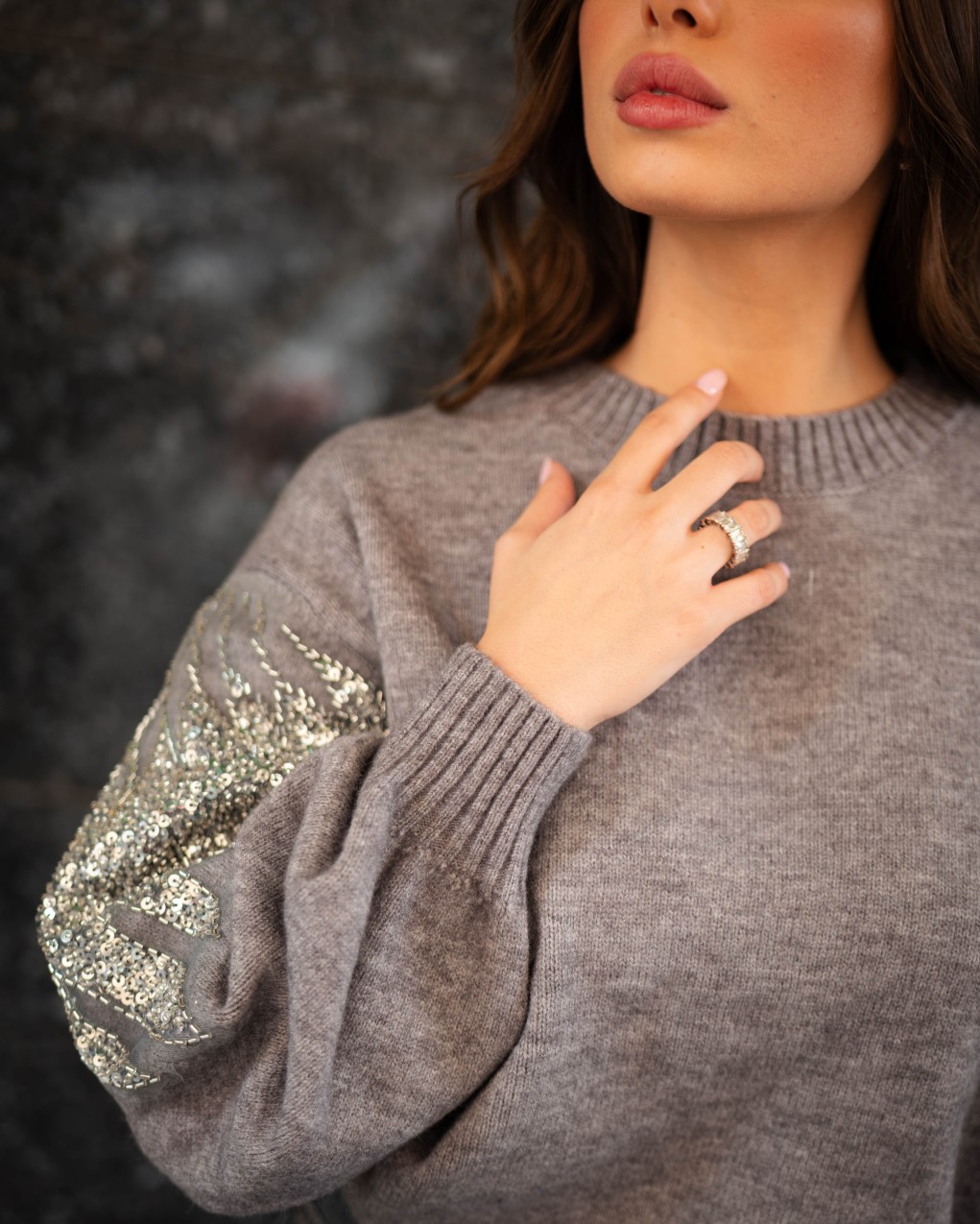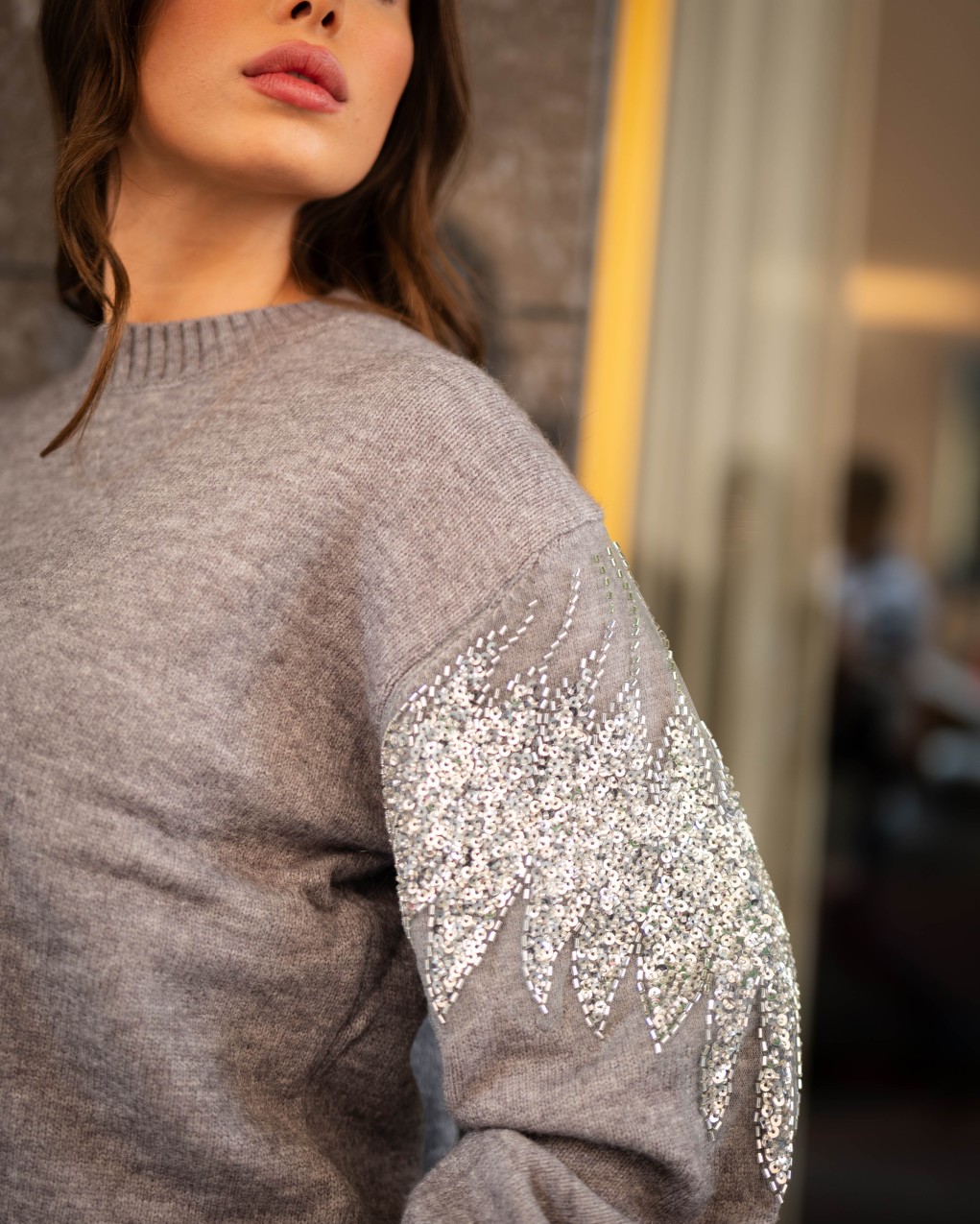Maglione oversize in morbida lana con dettagli decorativi in paillettes sulle maniche. Il design presenta un collo a costine, maniche ampie a palloncino e una vestibilità comoda e avvolgente. La combinazione di comfort casual e dettagli luminosi rende questo capo perfetto per elevare i look quotidiani con un tocco di eleganza.
