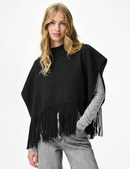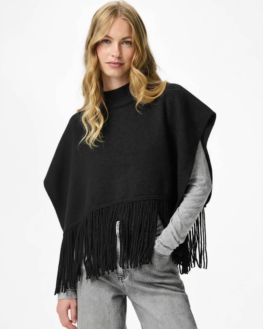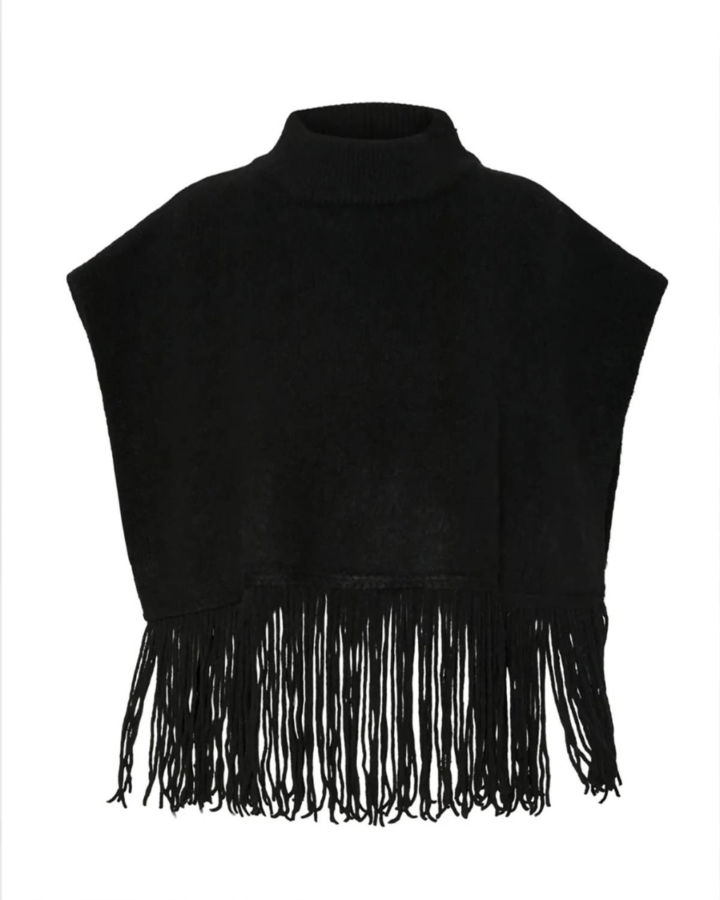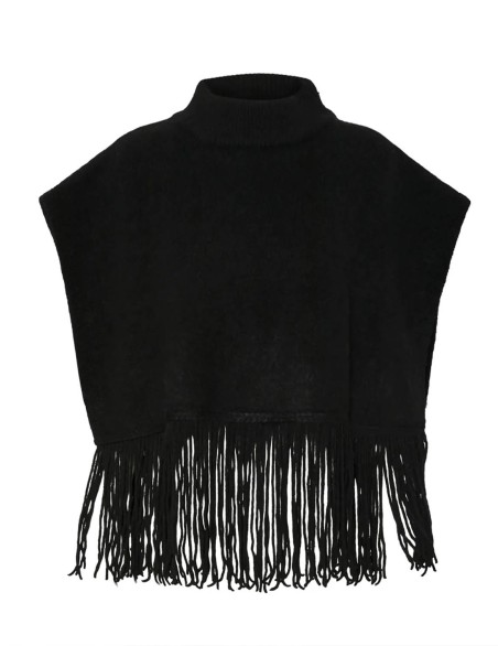 Poncho senza maniche con collo alto dallo stile bohémien-chic, caratterizzato da una cascata di frange decorative sul fondo. Realizzato in morbido tessuto elasticizzato che garantisce una vestibilità aderente e confortevole. La lunghezza cropped e il design minimal con dettaglio frangiato lo rendono perfetto per look alla moda sia casual che serali.