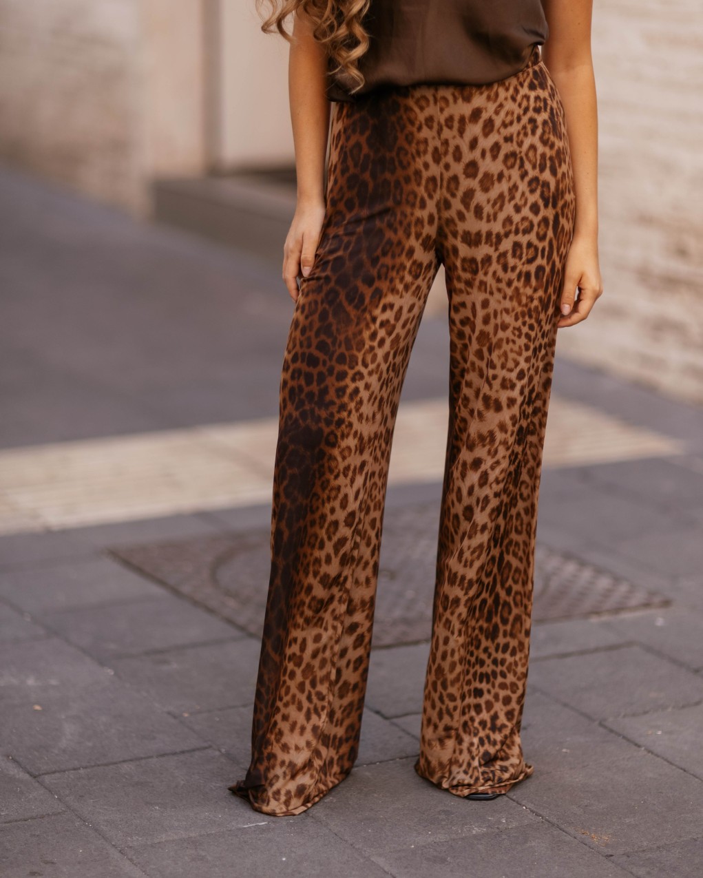 Pantaloni palazzo in tessuto fluido con audace stampa animalier, perfetti per un look sofisticato e di tendenza. Il taglio ampio e la vita alta garantiscono massimo comfort e una silhouette elegante. La texture leggera e la caduta morbida del tessuto rendono questo capo ideale per outfit sia casual che eleganti.