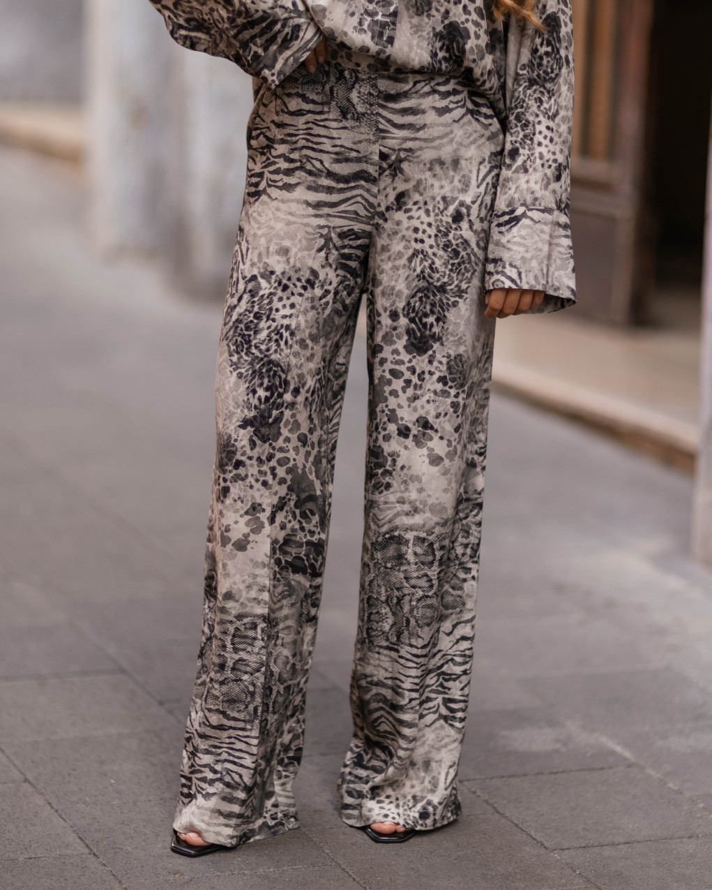 Pantaloni palazzo dal taglio fluido e sofisticato con stampa animalier all-over. Realizzati in tessuto leggero e scorrevole, presentano una vita alta e una gamba ampia che si allarga elegantemente fino al fondo. Il design versatile e la vestibilità comoda li rendono perfetti sia per look casual che per occasioni più formali.