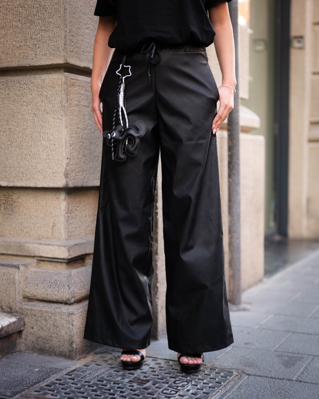 Pantaloni palazzo dalla linea moderna e sofisticata, realizzati in tessuto fluido con vita elasticizzata regolabile. Il design wide-leg si distingue per l'elegante caduta e il taglio ampio che garantisce massimo comfort, mentre il dettaglio decorativo laterale aggiunge un tocco di originalità. La vestibilità morbida e il tessuto di alta qualità li rendono perfetti per look sia casual che eleganti.