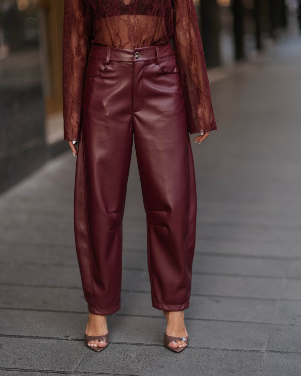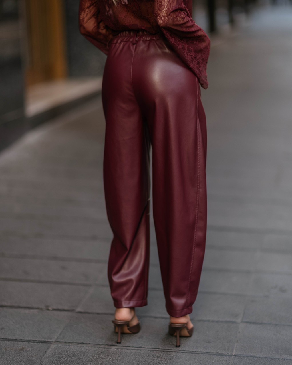Pantaloni eleganti in ecopelle dalla linea morbida e fluida, caratterizzati da una vestibilità comoda con vita elasticizzata. Il taglio contemporary con gamba ampia e leggermente affusolata conferisce un look sofisticato e versatile. La texture lucida del materiale e le cuciture minimal esaltano la qualità sartoriale del capo, perfetto per outfit sia casual che ricercati.