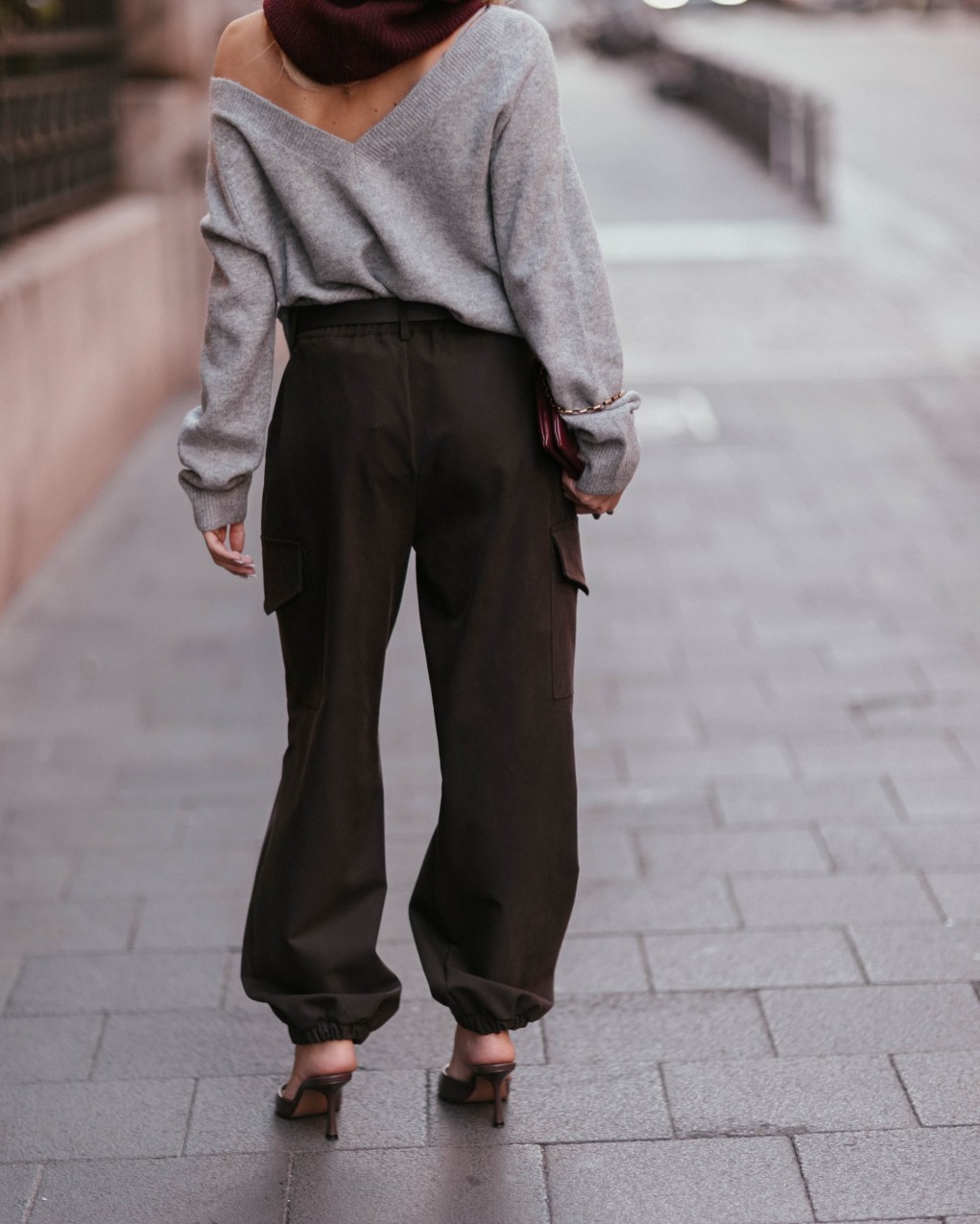 Pantalone cargo dal taglio moderno con gamba ampia e vita alta, realizzato in morbido tessuto con tasche laterali funzionali. La silhouette rilassata si stringe alla caviglia creando un effetto jogger, mentre la cintura in vita definisce la figura. Perfetto per un look casual-chic, unisce comfort e stile grazie alla sua vestibilità versatile e ai dettagli contemporanei.