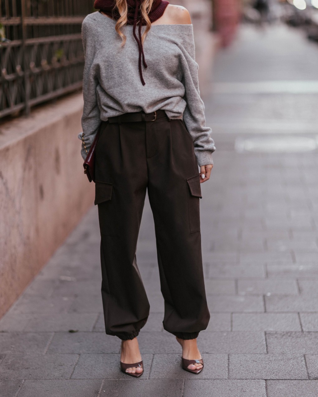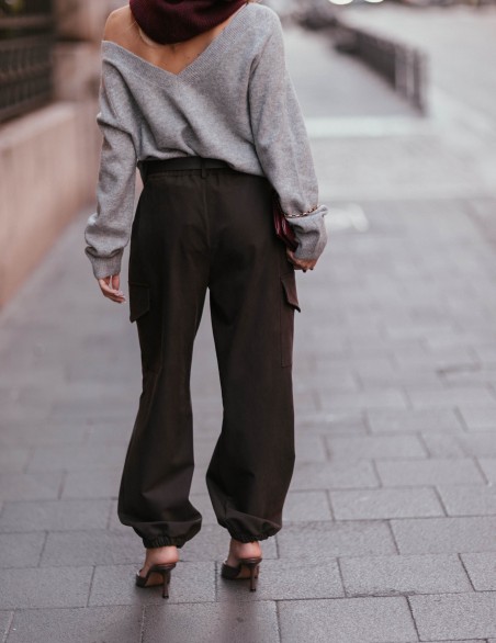Pantalone cargo dal taglio moderno con gamba ampia e vita alta, realizzato in morbido tessuto con tasche laterali funzionali. La silhouette rilassata si stringe alla caviglia creando un effetto jogger, mentre la cintura in vita definisce la figura. Perfetto per un look casual-chic, unisce comfort e stile grazie alla sua vestibilità versatile e ai dettagli contemporanei.