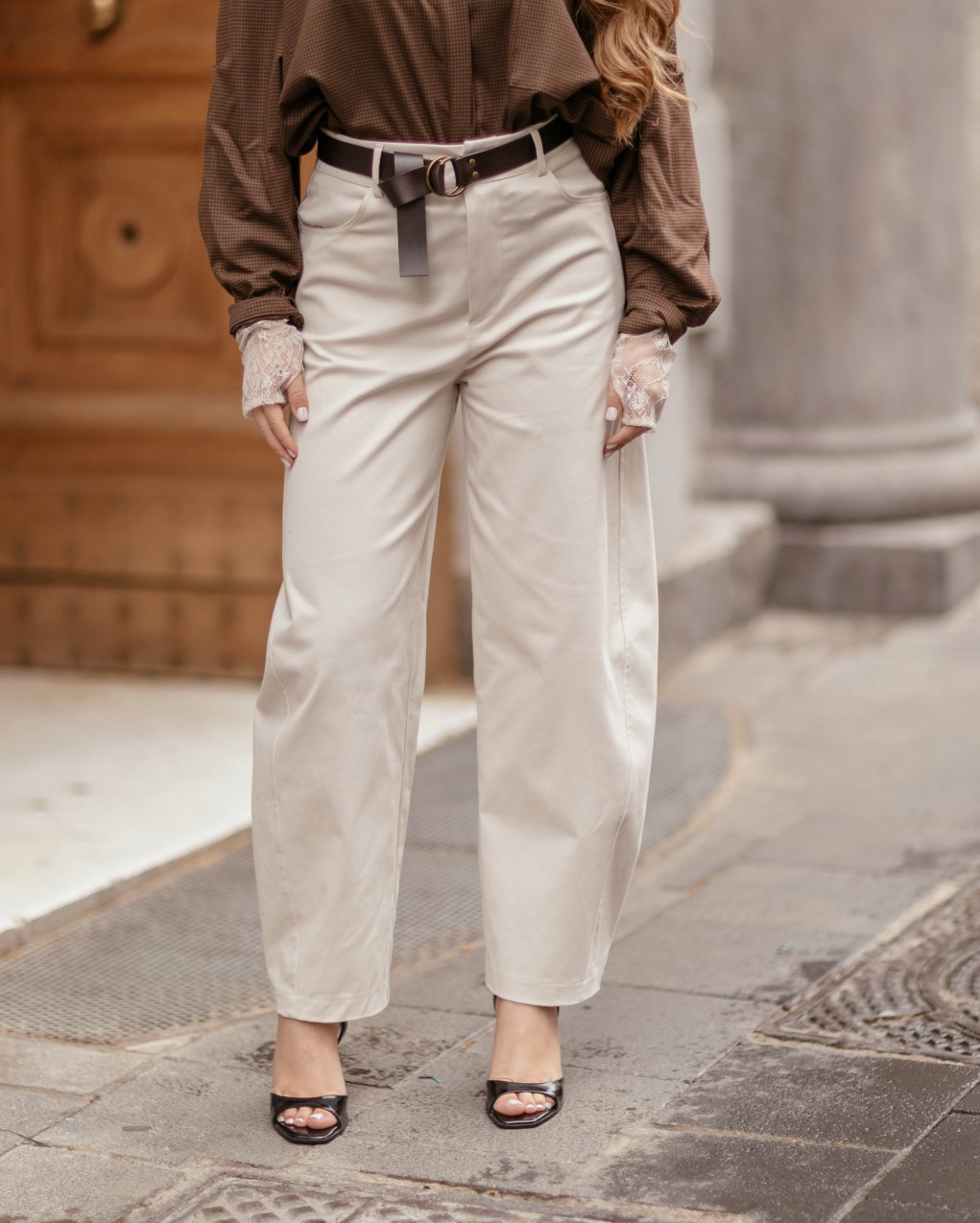 Pantaloni eleganti dalla linea ampia e moderna, realizzati in morbido cotone di alta qualità. Il taglio straight-leg si distingue per la vita alta con passanti e l'elegante cintura ad anello inclusa. La vestibilità comfort e la lunghezza alla caviglia rendono questo capo perfetto per outfit sia casual che formali.