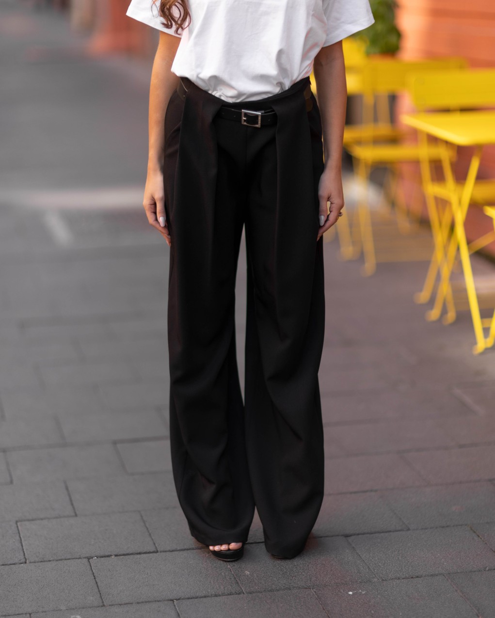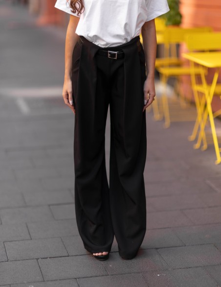 Pantaloni palazzo a vita alta, realizzati in tessuto fluido e leggero che accompagna i movimenti con eleganza. La linea ampia e il taglio sartoriale conferiscono un’eleganza naturale, adatta sia a contesti formali sia a look più rilassati. Da indossare con sneakers o sandali per un effetto effortless chic.