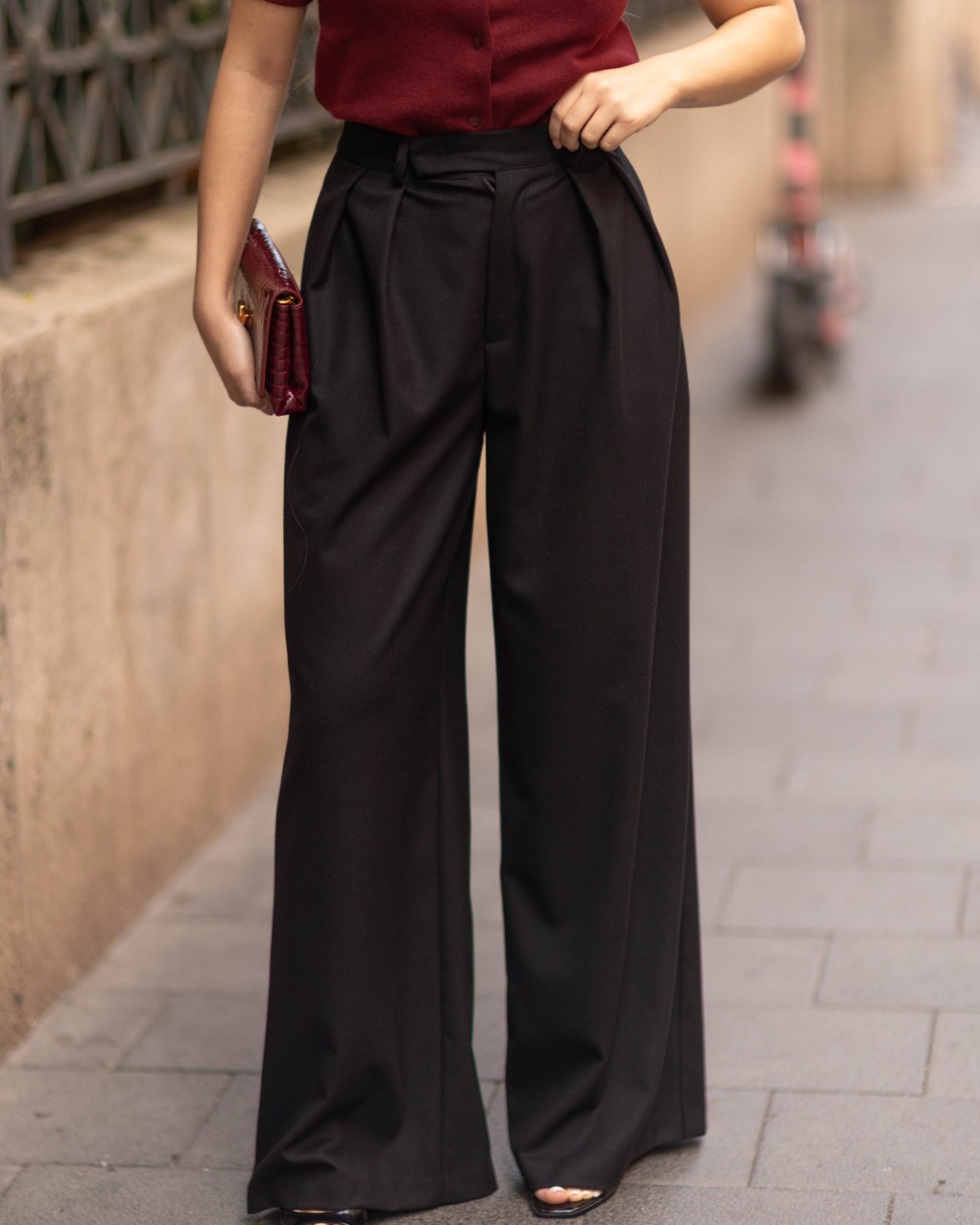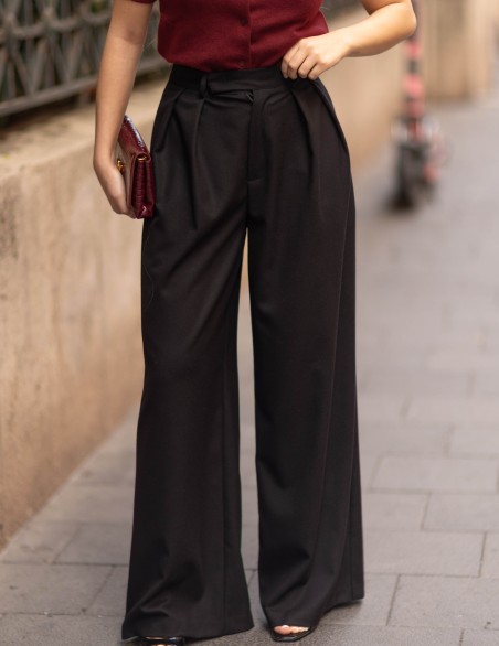 Eleganti pantaloni palazzo dallo stile sartoriale contemporaneo, caratterizzati da una silhouette ampia e fluida. Il design presenta vita alta con cintura integrata, profonde pinces frontali che creano volume controllato e tasche laterali funzionali. Realizzati in tessuto di qualità con finitura opaca, offrono una vestibilità comoda e rilassata che slancia la figura. Ideali per outfit eleganti da giorno o serate formali, perfetti da abbinare con camicie e cardigan per un look sofisticato.