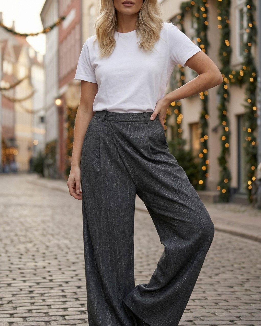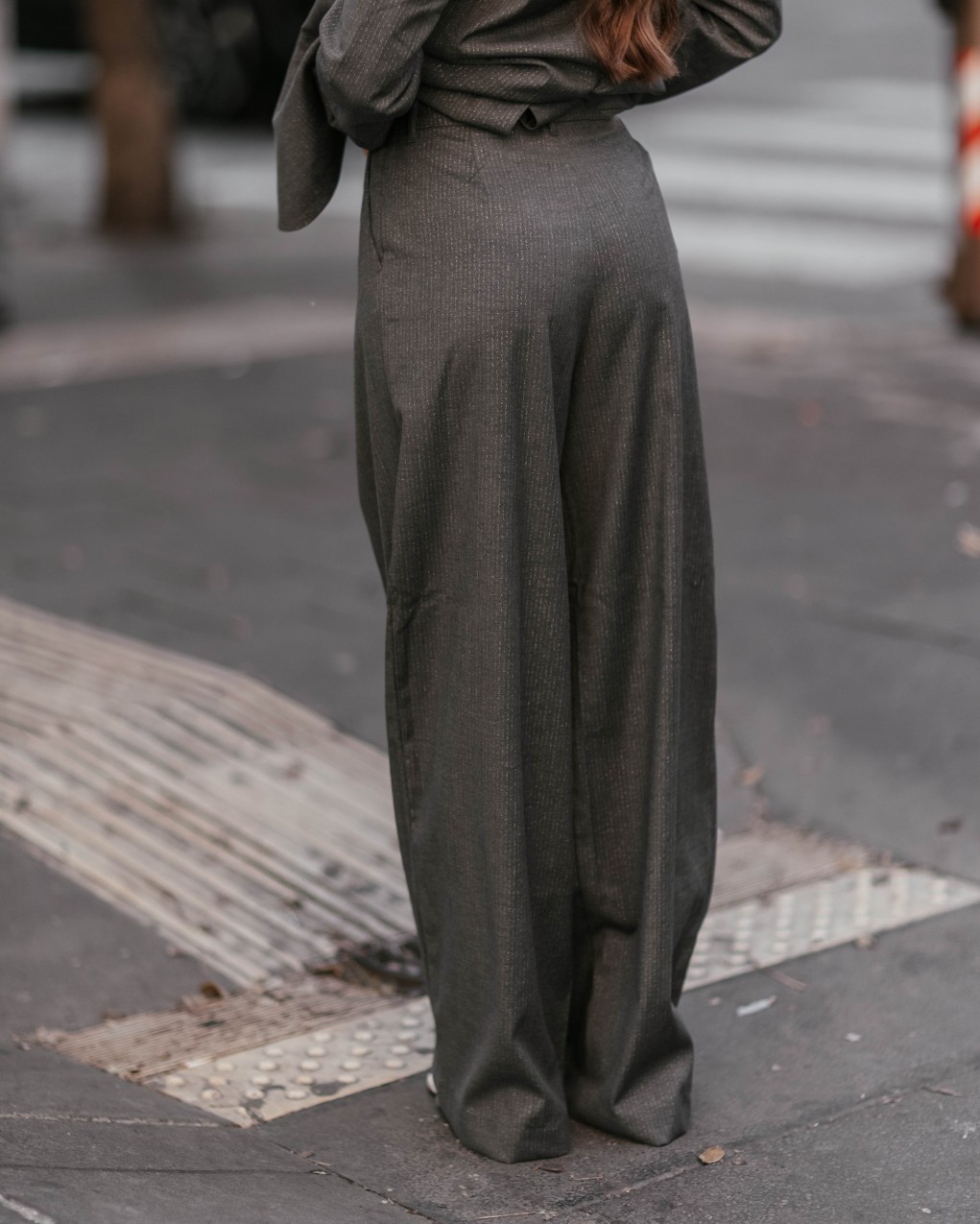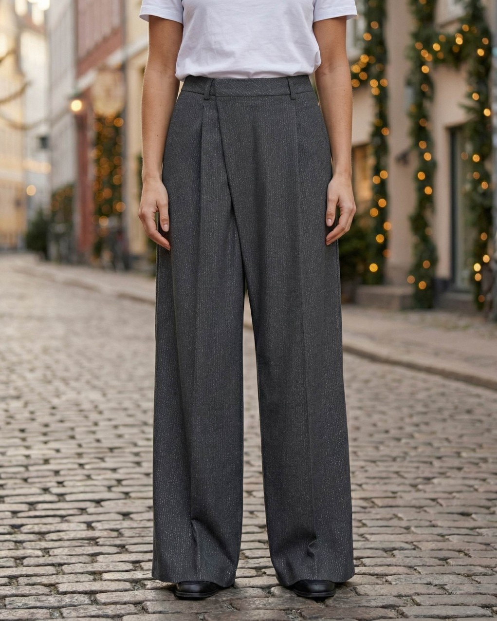 Pantaloni palazzo dallo stile elegante e contemporaneo, ideali per outfit sofisticati da giorno e da sera. Il taglio rilassato garantisce massimo comfort e libertà di movimento, perfetti per un look professionale o per occasioni speciali.