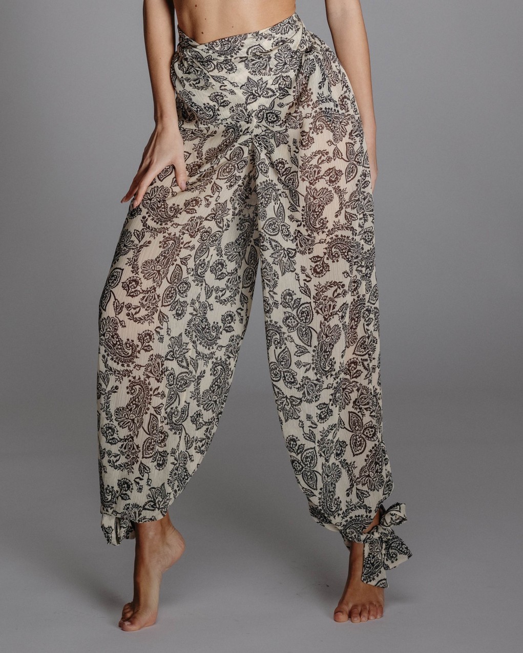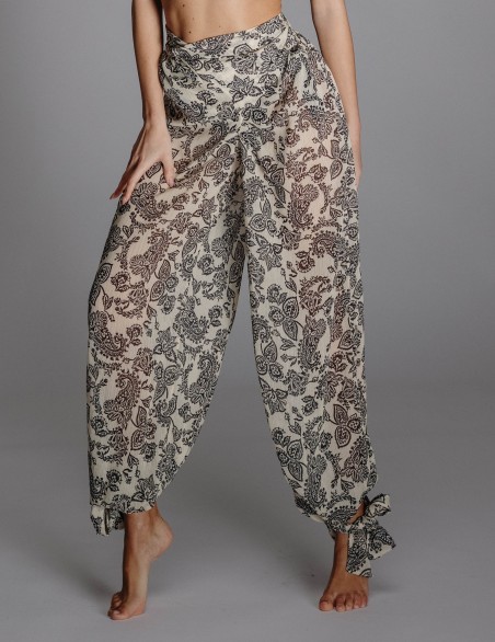 Pantaloni stile harem dal design boho-chic, caratterizzati da un'elegante stampa paisley all-over. Realizzati in tessuto leggero e fluido, ideale per la stagione calda, con vita alta elasticizzata per il massimo comfort. La vestibilità è ampia e morbida con cavallo basso e lacci decorativi alle caviglie, perfetti per un look casual-elegante o per momenti di relax. Capo versatile che unisce stile etnico e praticità quotidiana.