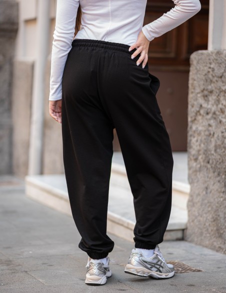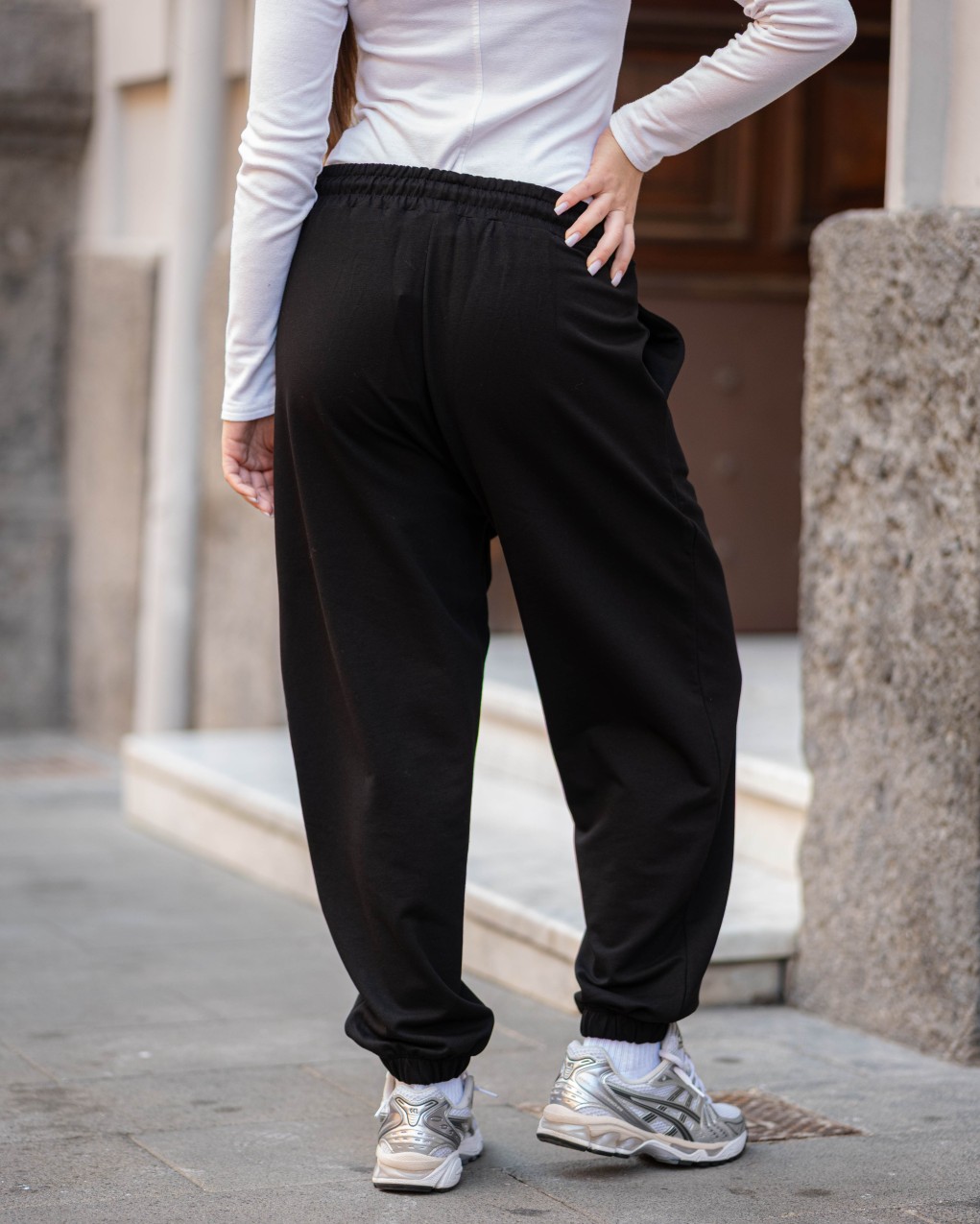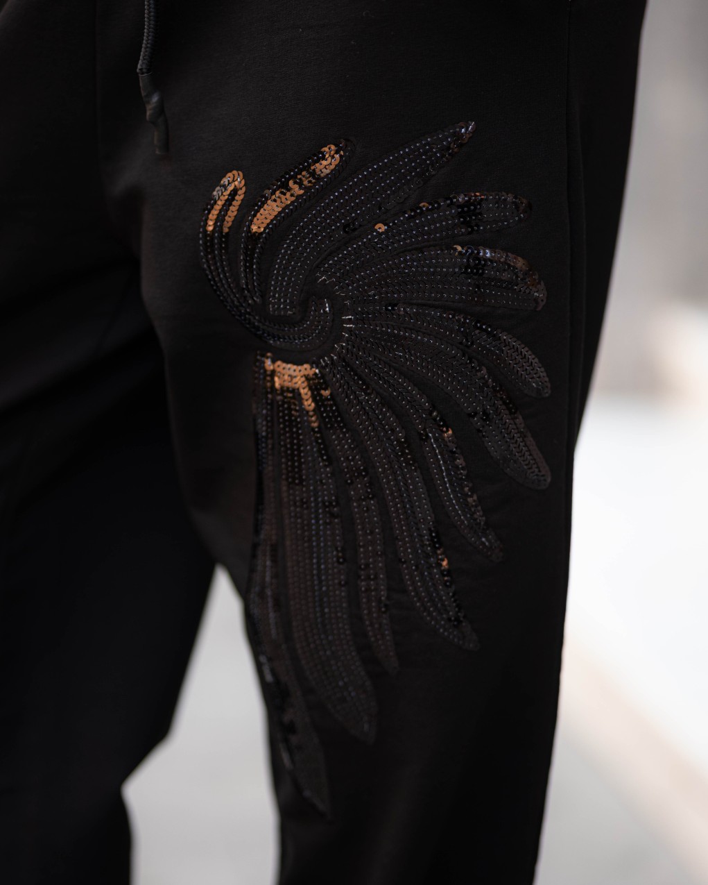 Pantaloni jogger in morbido tessuto felpato, caratterizzati da un elegante ricamo con applicazione di perline raffigurante un motivo decorativo sulla gamba. Il design casual presenta vita elastica con coulisse regolabile, tasche laterali funzionali e polsini elastici alle caviglie. Vestibilità comoda e rilassata, ideale per un look streetwear contemporaneo che unisce comfort e dettagli ricercati.