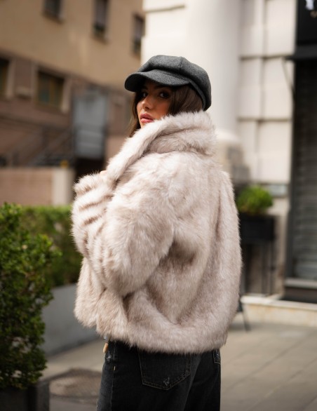 Elegante giacca corta in pelliccia ecologica dal design sofisticato, caratterizzata da un ampio collo revers e una silhouette moderna e compatta. La texture lussuosa e morbida del tessuto garantisce comfort e calore, mentre il taglio cropped la rende perfetta per outfit alla moda. La vestibilità regular e la chiusura frontale assicurano praticità e versatilità nell'abbinamento.