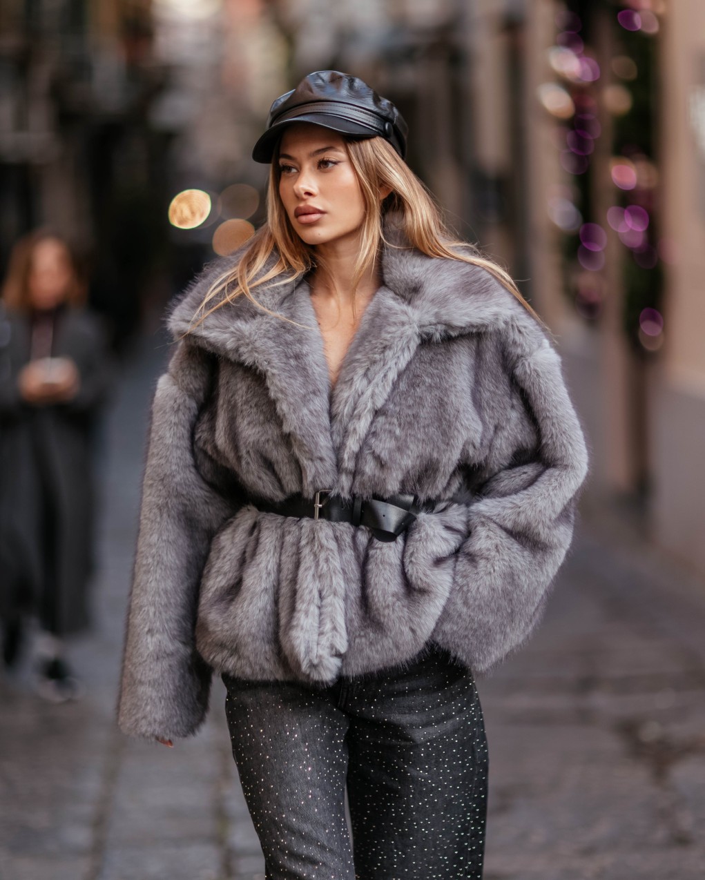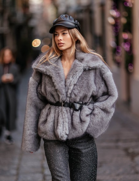 Giacca corta in pelliccia ecologica dallo stile glamour e contemporaneo, perfetta per la stagione fredda. Caratterizzata da un ampio collo a rever, maniche lunghe e vestibilità oversize che garantisce comfort e movimento. Realizzata in morbida pelliccia sintetica di alta qualità con texture voluminosa e lussuosa. Si abbina perfettamente con una cintura in vita per enfatizzare la silhouette, creando un look sofisticato e di tendenza.