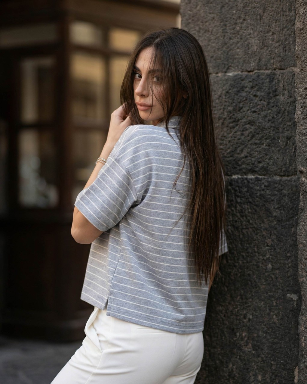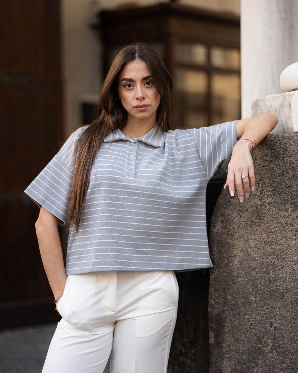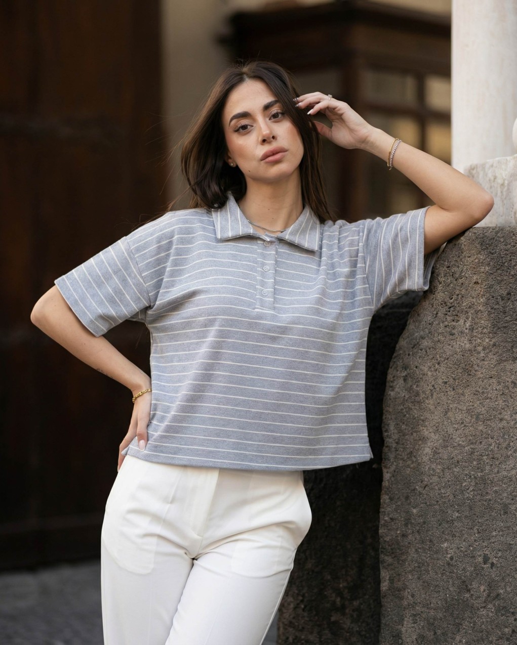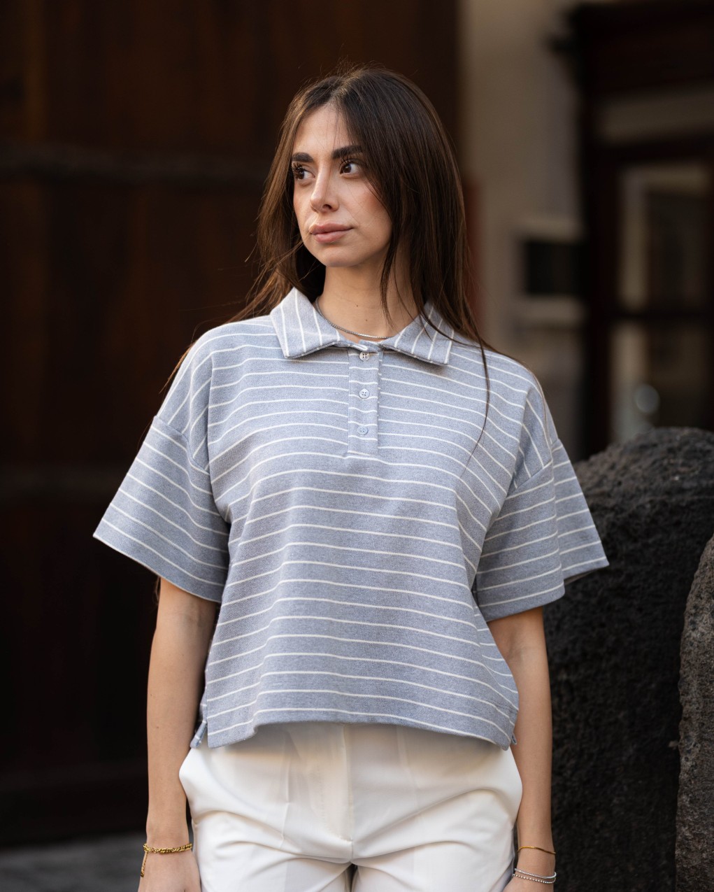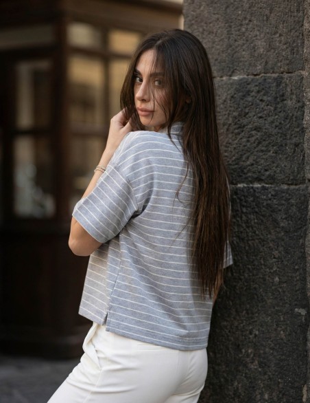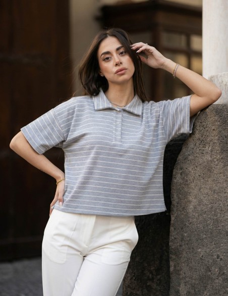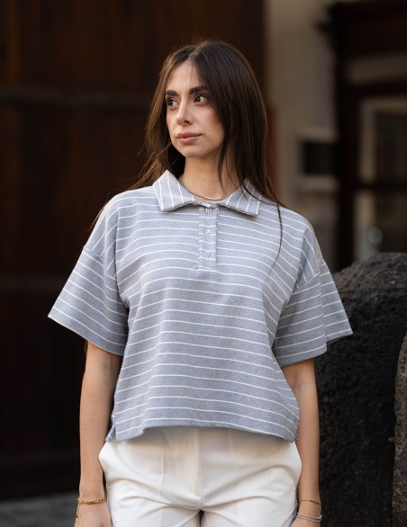 Polo shirt donna dallo stile casual-sportivo con design a righe orizzontali. Caratterizzata da colletto classico con bottoncini funzionali e maniche corte ampie per un look rilassato. Realizzata in morbido tessuto jersey che garantisce comfort e praticità d'uso. Vestibilità cropped e oversize per una silhouette moderna e di tendenza, perfetta da abbinare a pantaloni a vita alta.
