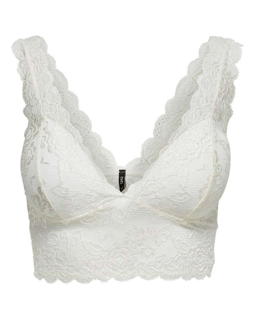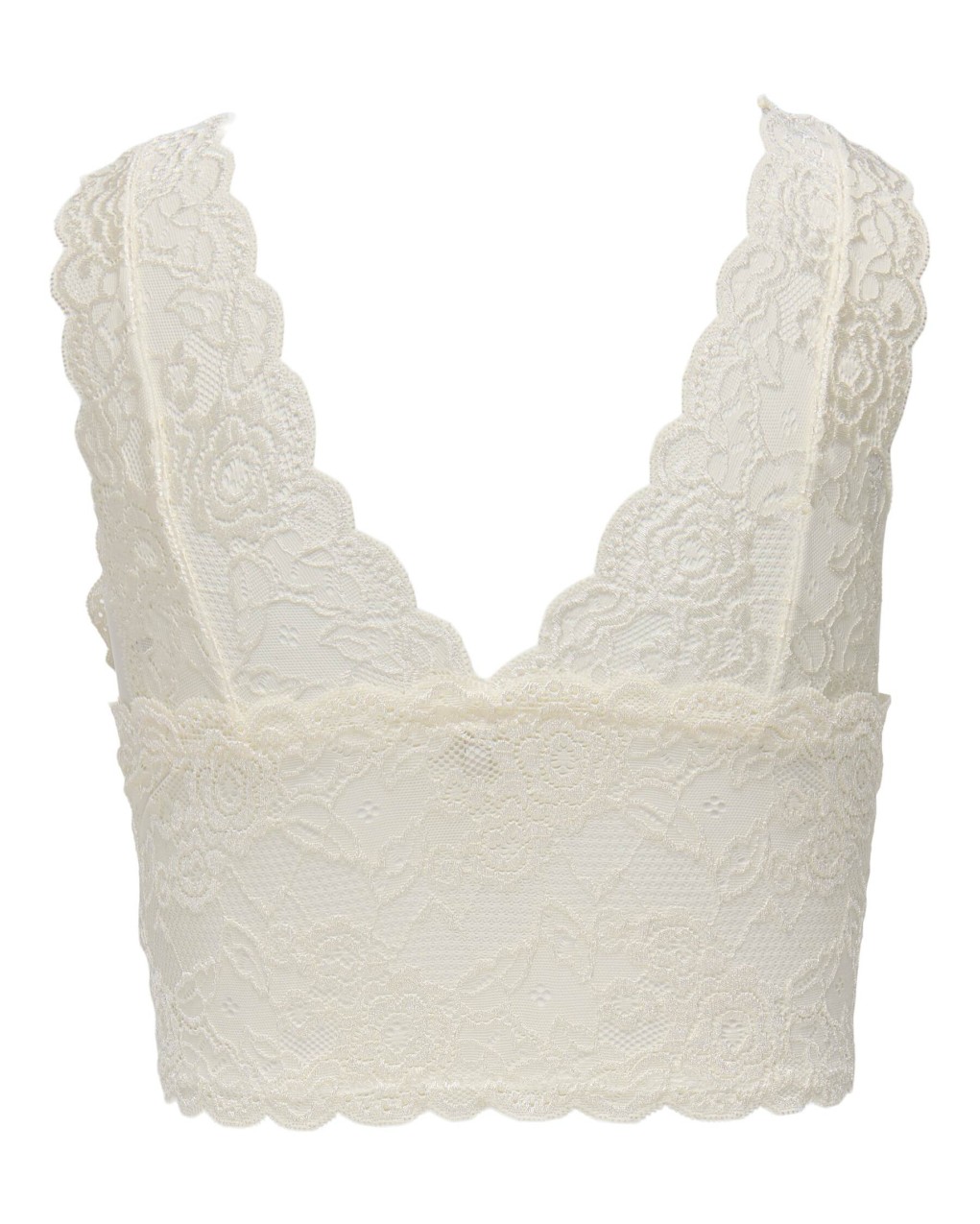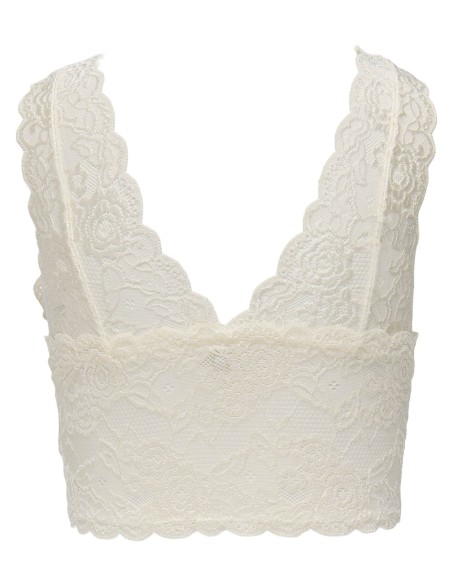 Bralette in pizzo floreale dallo stile elegante e romantico, perfetta per un look femminile e sofisticato. Realizzata interamente in delicato pizzo stretch con bordi decorativi, presenta una profonda scollatura a V e design senza ferretto per il massimo comfort. Le spalline sottili e il taglio aderente garantiscono una vestibilità avvolgente che valorizza la silhouette. Ideale sia come intimo ricercato che come capo visibile sotto giacche o top trasparenti.