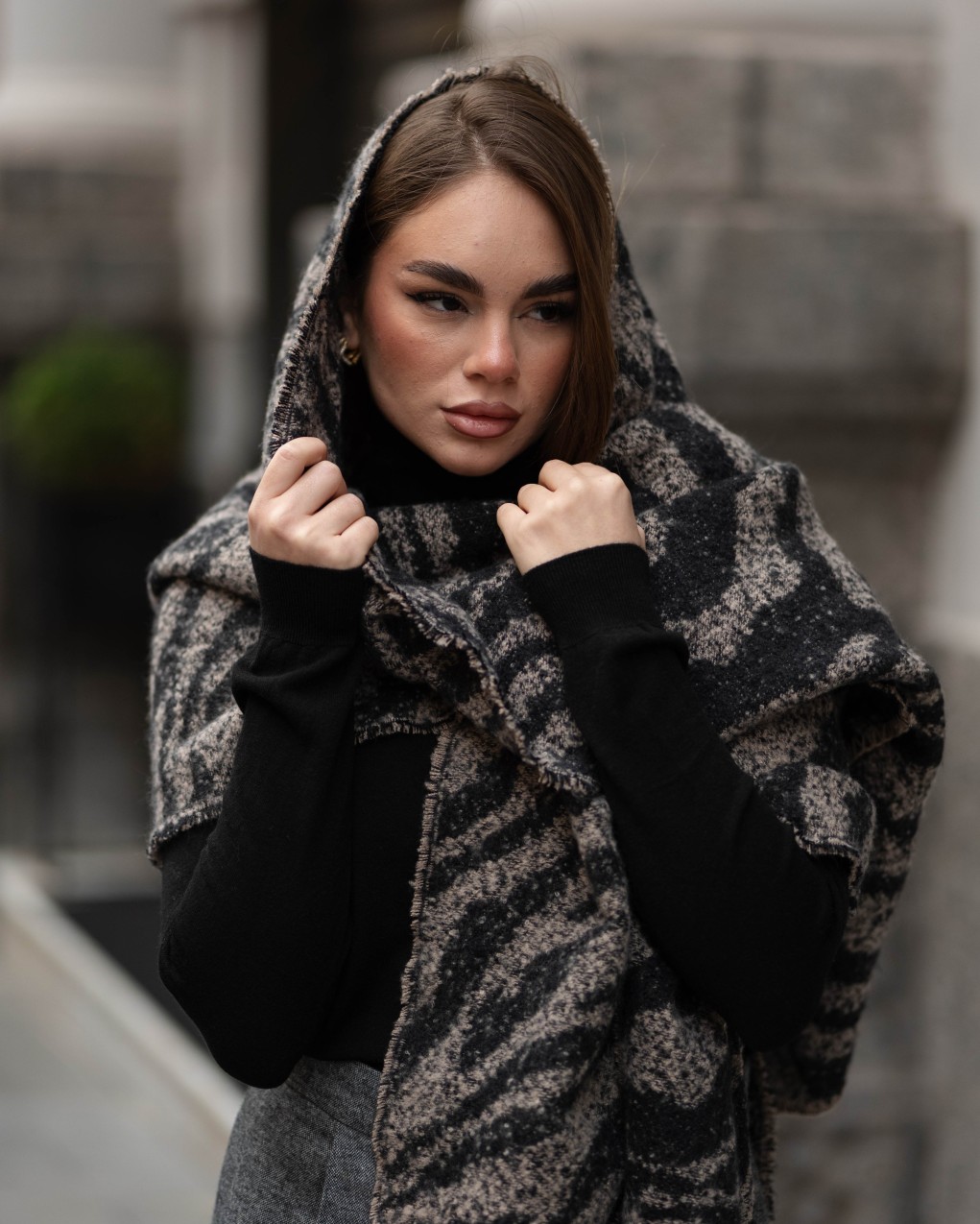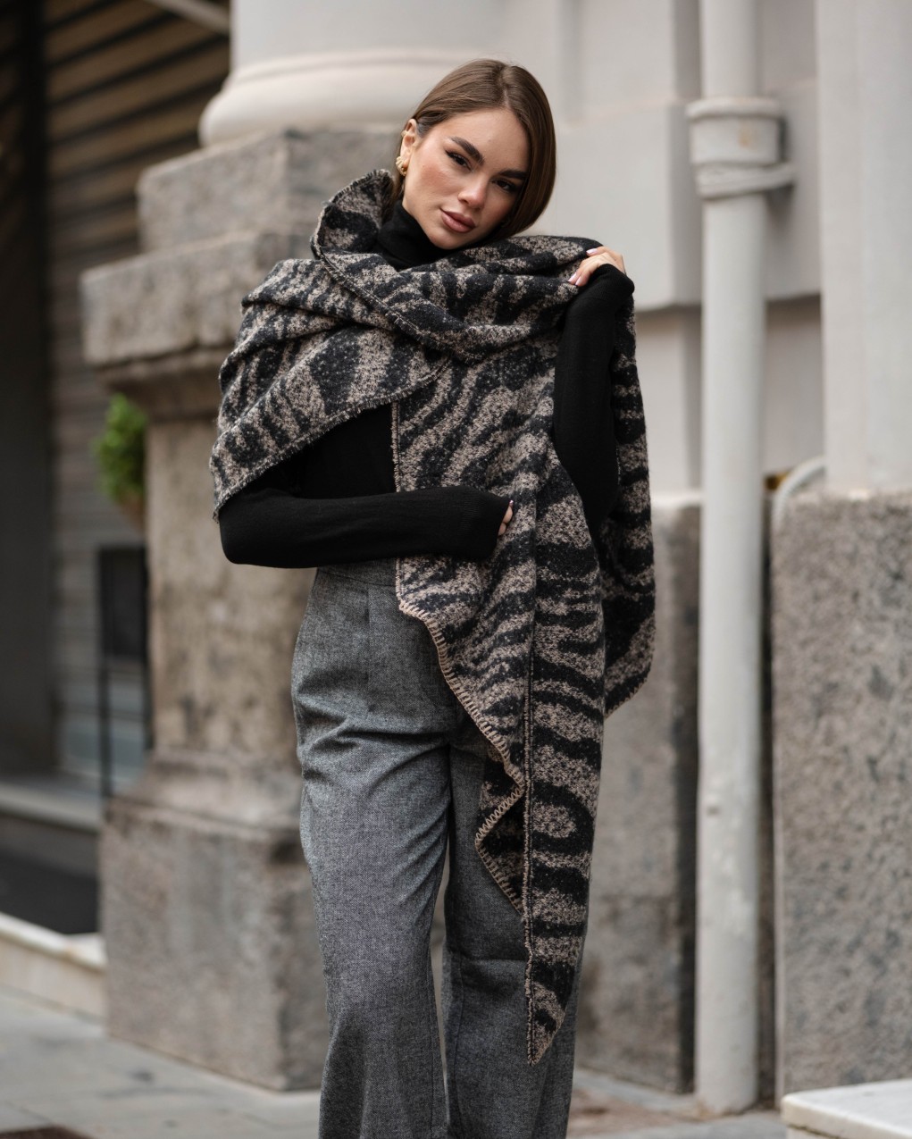 Sciarpa dallo stile urban contemporaneo, caratterizzato da un elegante motivo jacquard texturizzato. Realizzato in misto lana di alta qualità, offre calore e comfort durante la stagione fredda. La vestibilità ampia e rilassata garantisce massima libertà di movimento. Perfetto per outfit casual-chic da città, si abbina facilmente a capi basic per un look sofisticato e moderno.