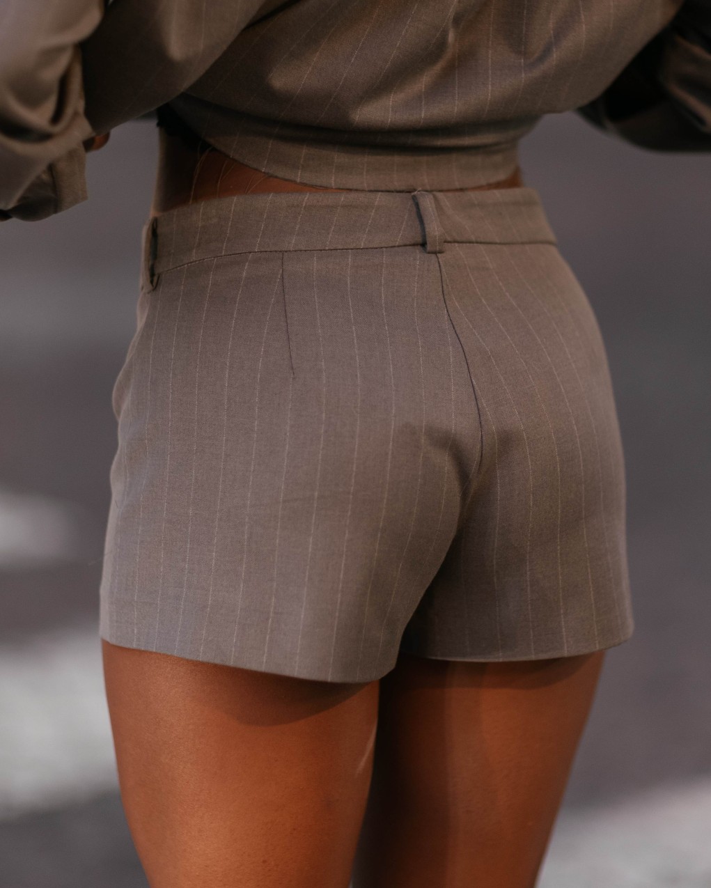 Eleganti shorts sartoriali in tessuto gessato di alta qualità, caratterizzati da una vestibilità aderente e vita alta. Il taglio sofisticato presenta pinces frontali e passanti per cintura, garantendo una silhouette raffinata e moderna. La lunghezza midi e il tessuto strutturato li rendono perfetti per look business-casual o occasioni formali estive.