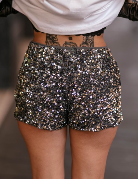 Short eleganti completamente ricoperti di paillettes luminose, perfetti per occasioni speciali e serate glamour. Realizzati con tessuto elasticizzato che garantisce comfort e libertà di movimento, presentano una vestibilità aderente a vita media. Il design ricco di paillettes applicate su tutta la superficie crea un effetto scintillante e sofisticato, ideale per completare look da festa e cerimonia.