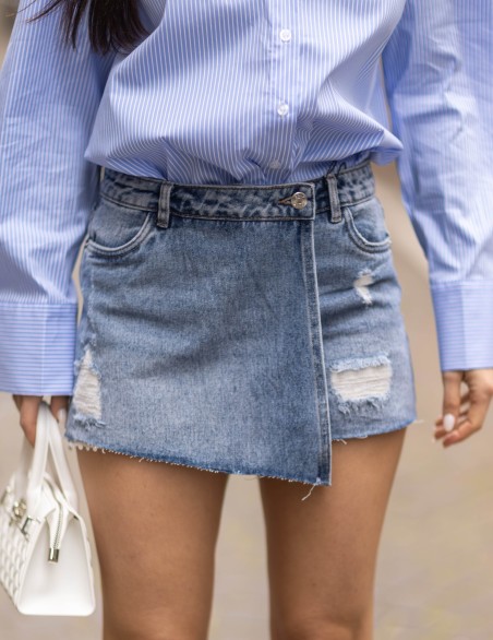 Minigonna in denim dal design moderno e giovanile, caratterizzata da un innovativo taglio asimmetrico sul davanti. Realizzata in robusto tessuto di cotone denim con finitura leggermente sbiadita e autentici dettagli destroyed e strappi per un look urban-casual. La vestibilità è aderente a vita media, con chiusura frontale a bottone e cinque tasche classiche, mentre l'orlo sfrangiato grezzo aggiunge un tocco contemporaneo e di carattere al capo.