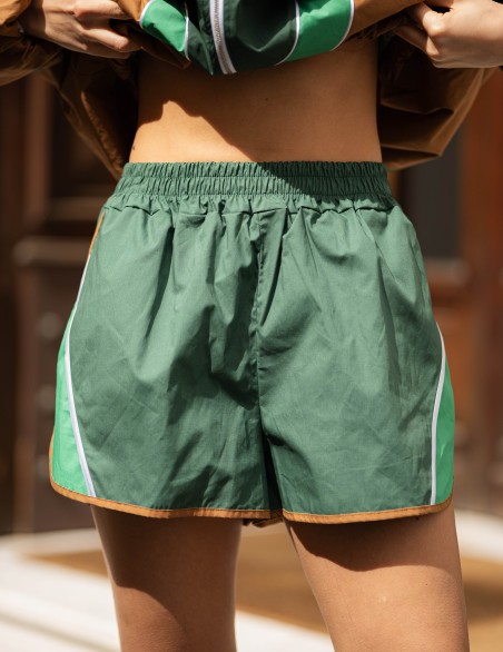 Pantaloncini sportivi dal design atletico vintage, caratterizzati da inserti laterali a contrasto e bordature decorative. Realizzati in tessuto tecnico leggero e traspirante, ideali per attività sportive o casual wear. La vestibilità è comoda e rilassata, con elastico in vita per un fit regolabile e massima libertà di movimento.