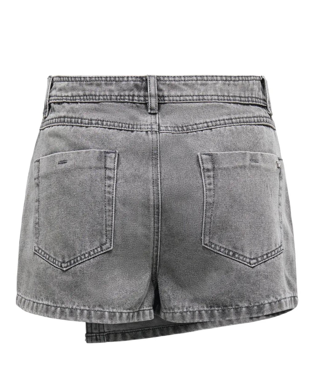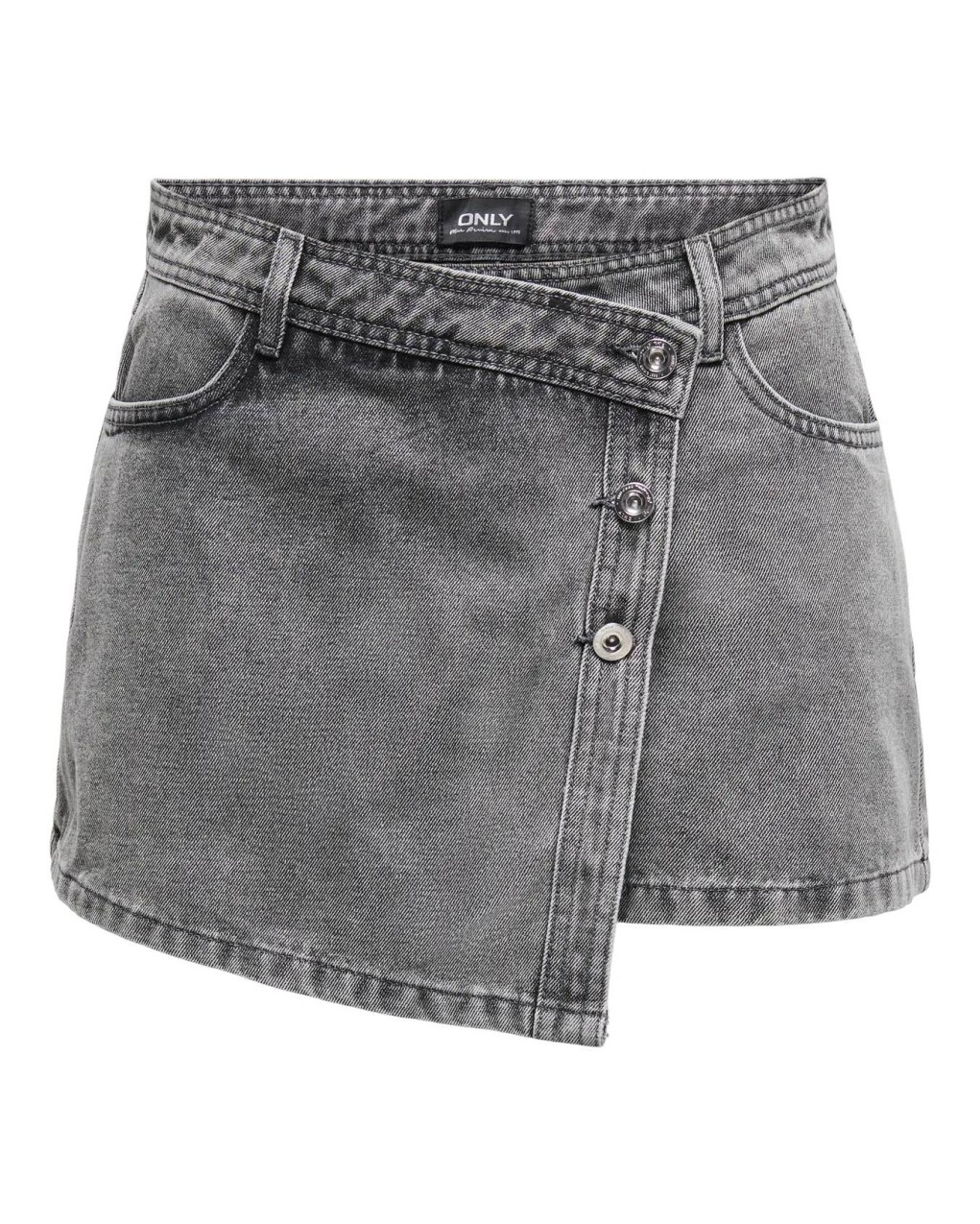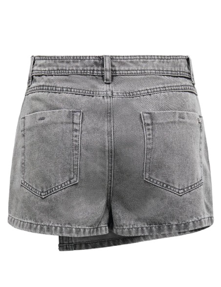 Gonna-pantalone corta in denim con design asimmetrico e dettaglio a portafoglio sovrapposto. Realizzata in tessuto denim effetto stone-washed, presenta chiusura con bottoni a pressione decorativi sulla pannello frontale. Lo stile casual-contemporary offre una silhouette moderna e versatile, perfetta per look urbani e quotidiani. La vestibilità è aderente con taglio a vita alta che valorizza la figura.