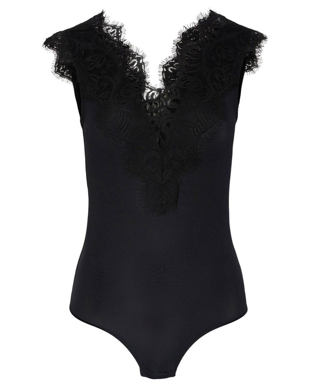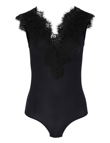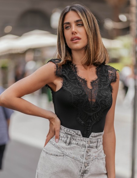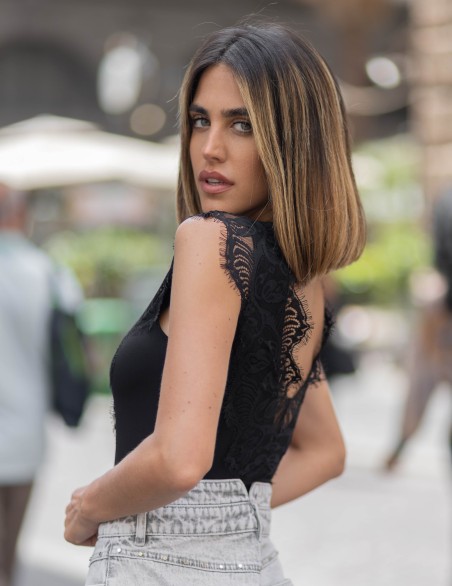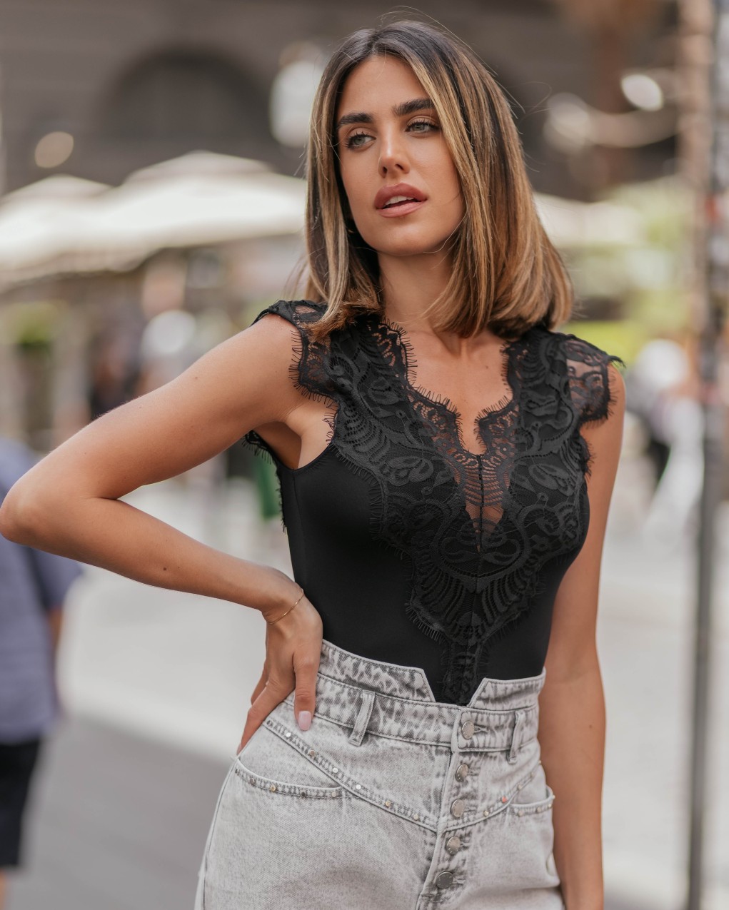 •Il body presenta inserti in pizzo al seno e alle spalle, che conferiscono un effetto delicato e femminile. Il pizzo è di alta qualità, con motivi intricati che si intrecciano per creare un contrasto elegante con il tessuto principale