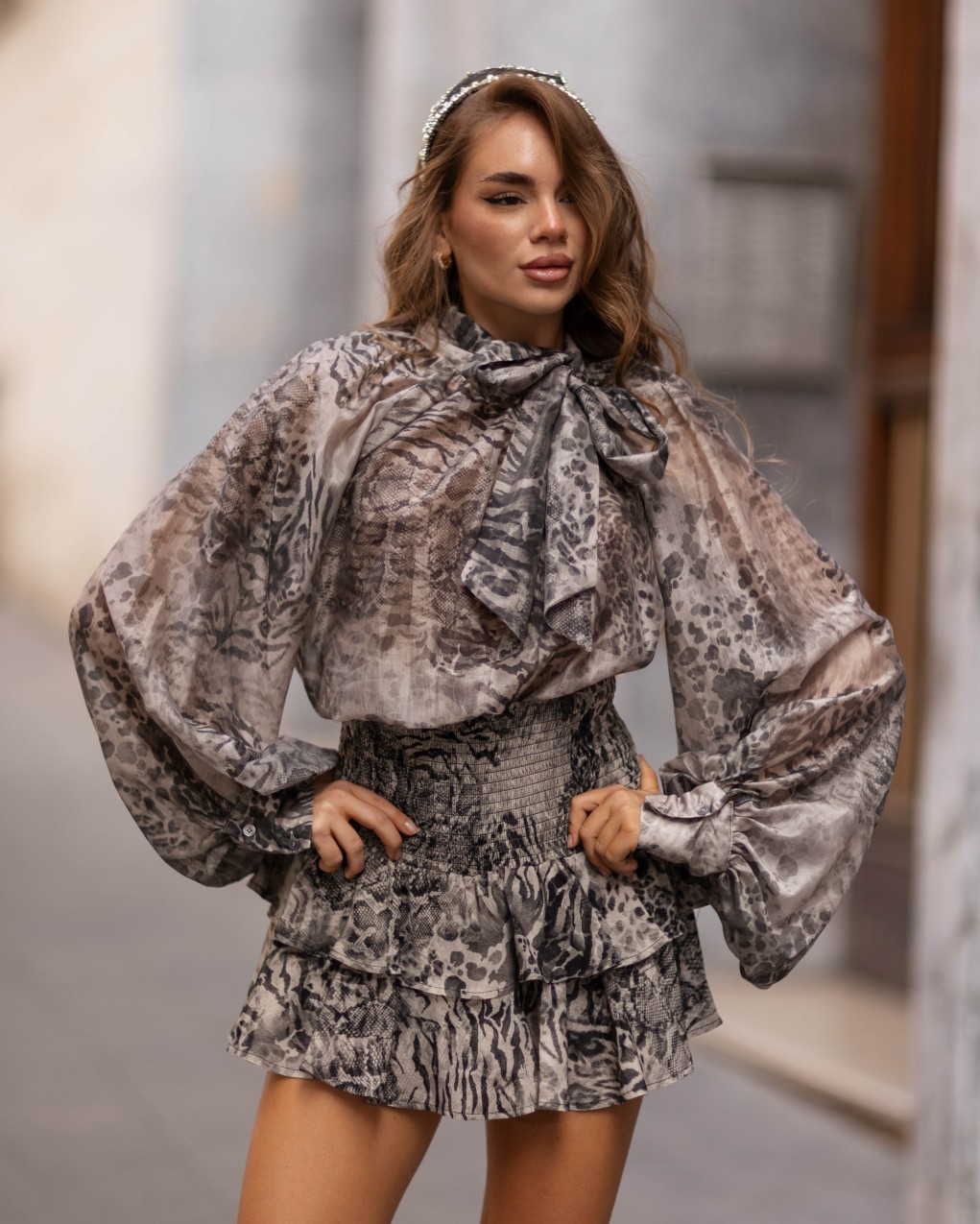●Elegante camicia con stampa animalier caratterizzato da maniche a palloncino voluminose con un tessuto leggero in seta che garantisce morbidezza e comfort. Un capo versatile che unisce raffinatezza e tendenza, perfetto per occasioni speciali o serate eleganti.