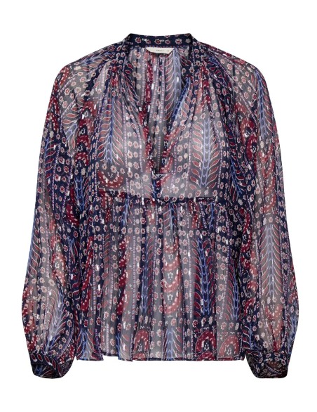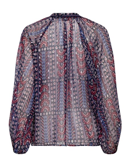 Elegante blusa in tessuto leggero e trasparente con raffinato motivo paisley e floreale. Il design presenta maniche a palloncino voluminose e collo con chiusura a goccia. La vestibilità morbida e fluida, insieme alla leggerezza del materiale, la rende perfetta per look sofisticati sia casual che formali.
