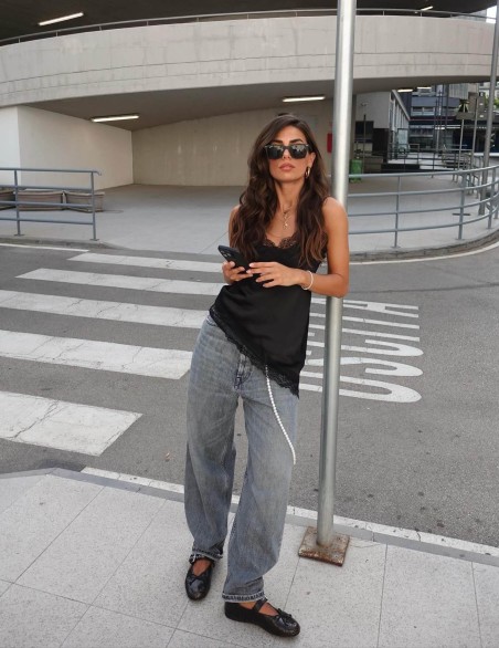 Top lingerie in setoso tessuto satinato con eleganti finiture in pizzo. Caratterizzato da spalline sottili regolabili e orlo asimmetrico con delicati dettagli in pizzo. Vestibilità morbida e fluida, perfetta da indossare come sottogiacca raffinato o come capo seducente.