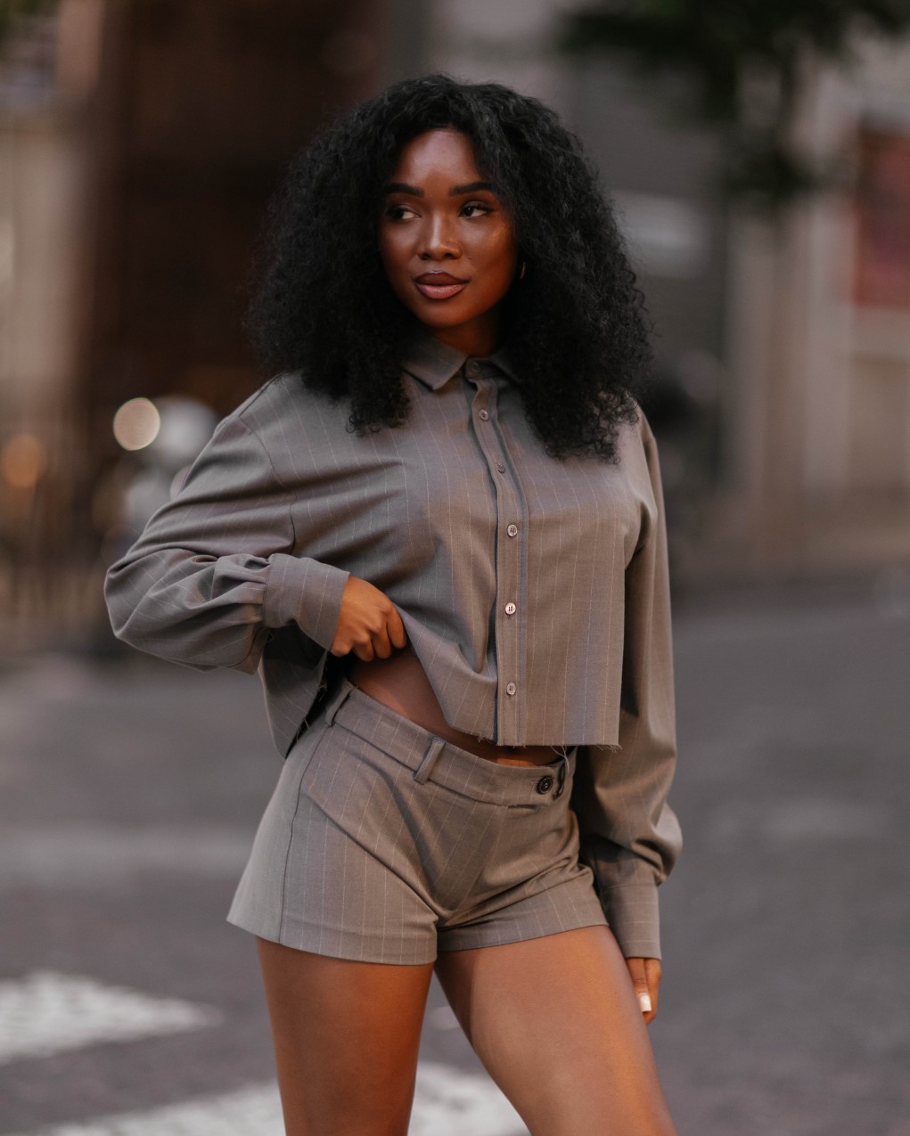 Elegante camicia oversize in tessuto gessato. La camicia presenta una vestibilità rilassata con spalle strutturate e linee pulite. Realizzato in pregiato tessuto con gessatura classica, questo completo versatile unisce il tailoring tradizionale a un design contemporaneo.