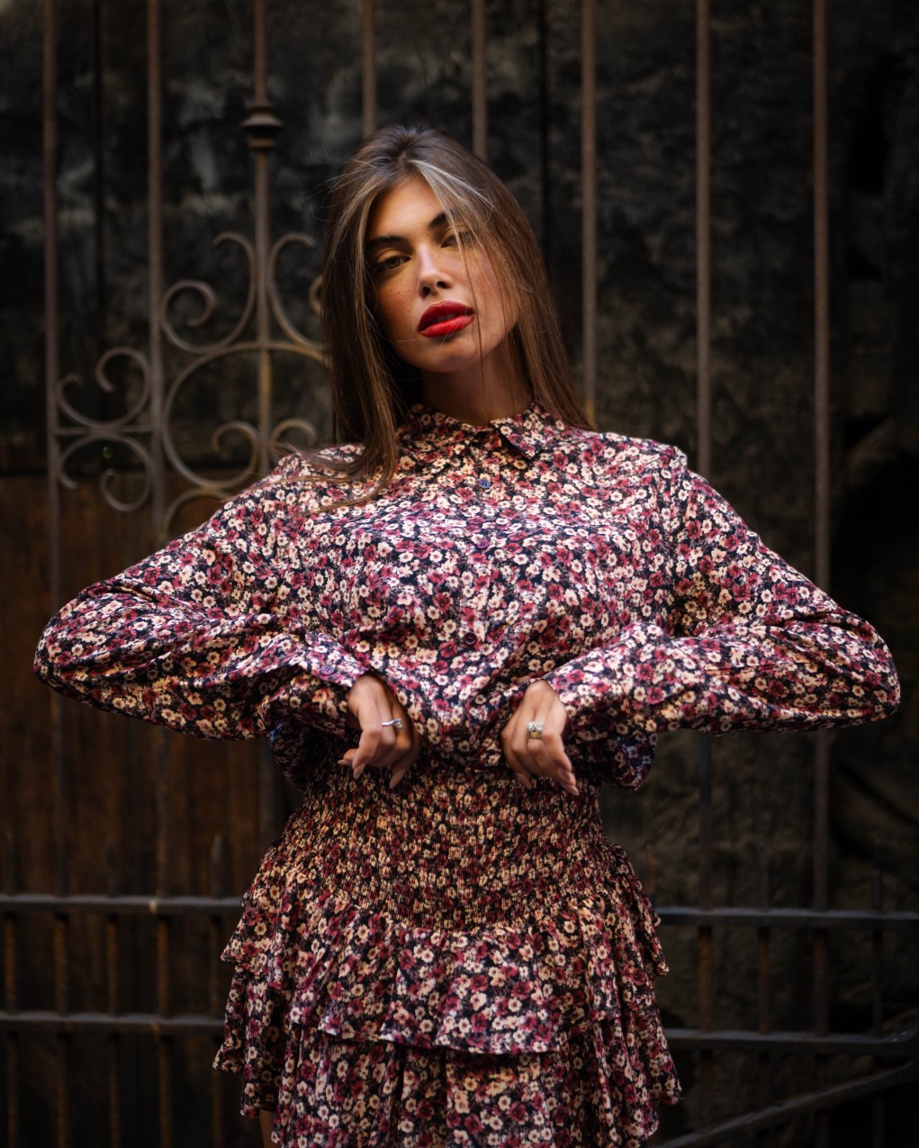 Camicia in tessuto leggero con delicata stampa floreale all-over. Il capo presenta maniche lunghe dalla vestibilità comoda e una silhouette femminile che si adatta dolcemente alle forme. La texture morbida e la costruzione raffinata lo rendono perfetto per occasioni sia casual che più formali.