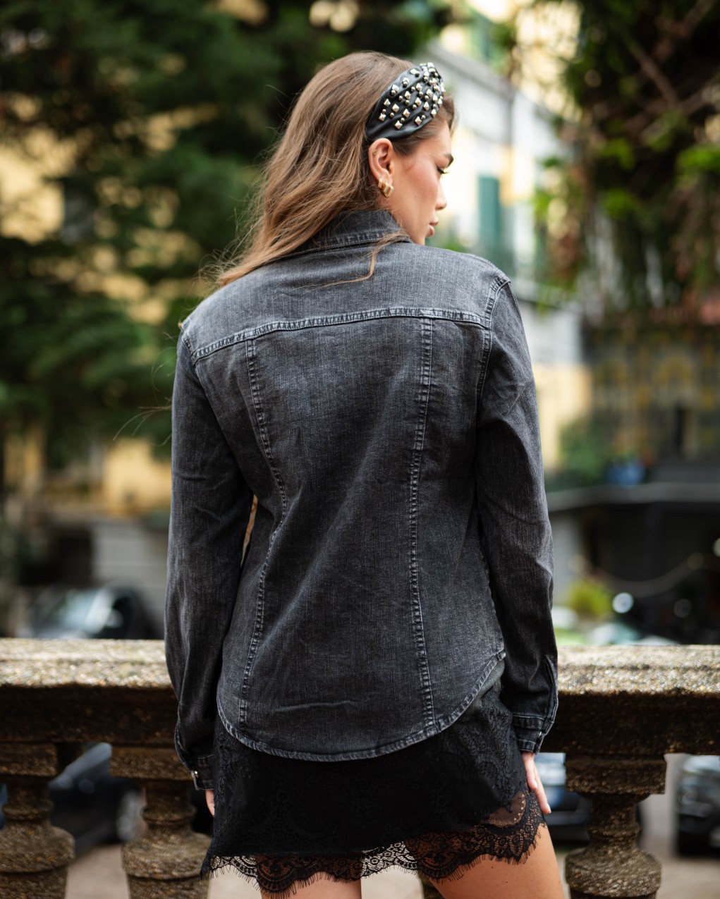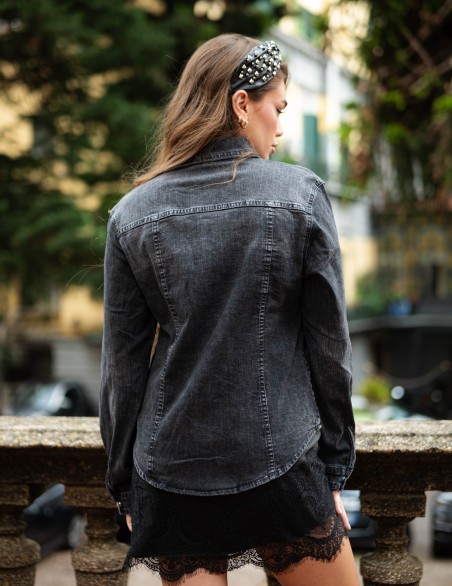 Camicia in denim dal taglio classico western con bottoni a pressione metallici e tasche frontali. Realizzata in morbido cotone denim stonewashed per un effetto vissuto di tendenza. La vestibilità regular con cuciture a vista e dettagli tradizionali si adatta perfettamente a ogni silhouette, ideale per look casual-chic.