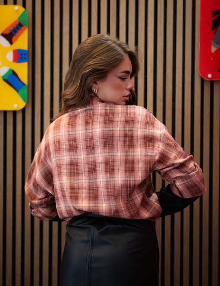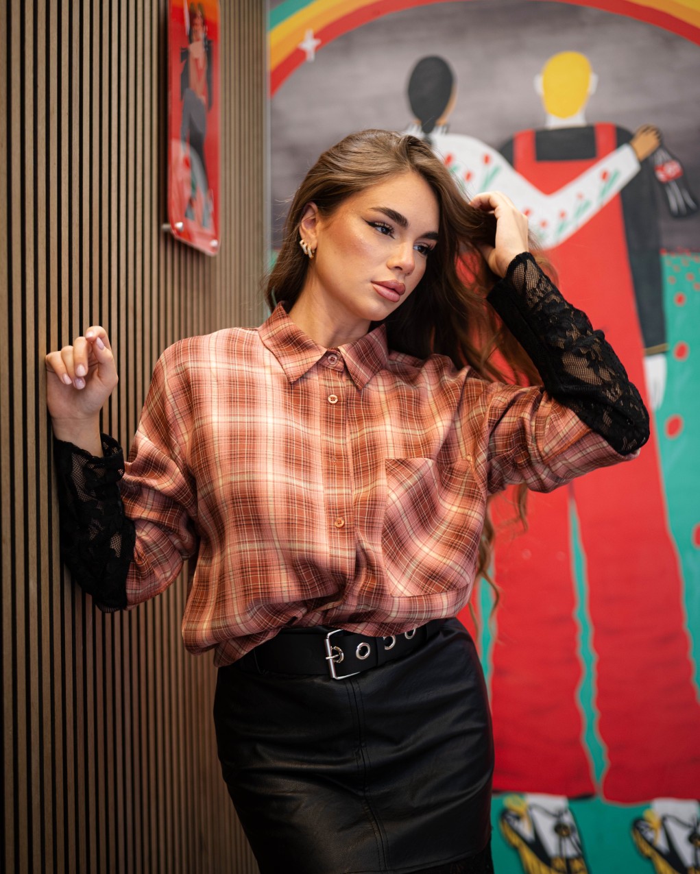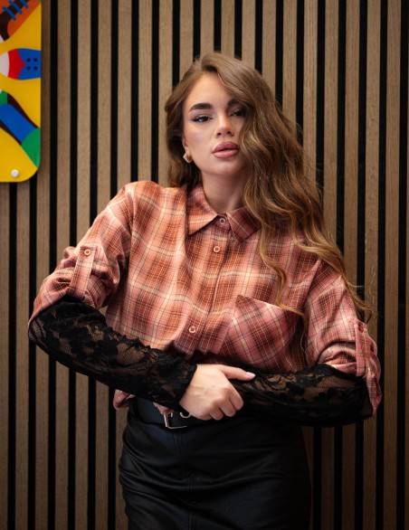 Camicia oversize in morbido tessuto a quadri con originale contrasto delle maniche in pizzo. Il design casual-chic presenta una linea comoda e versatile, impreziosita da bottoni frontali e classico colletto. La vestibilità ampia e il mix di tessuti rendono questo capo perfetto per outfit sia casual che ricercati.
