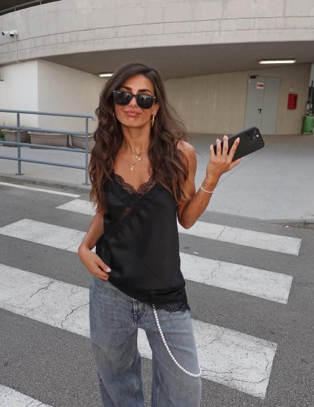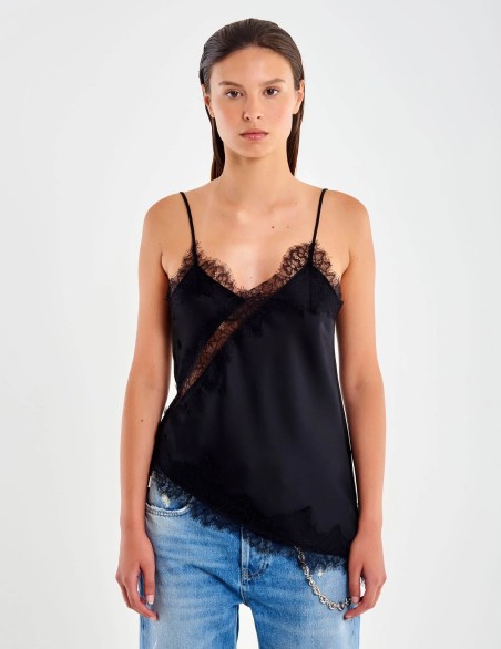 Top lingerie in setoso tessuto satinato con eleganti finiture in pizzo. Caratterizzato da spalline sottili regolabili e orlo asimmetrico con delicati dettagli in pizzo. Vestibilità morbida e fluida, perfetta da indossare come sottogiacca raffinato o come capo seducente.