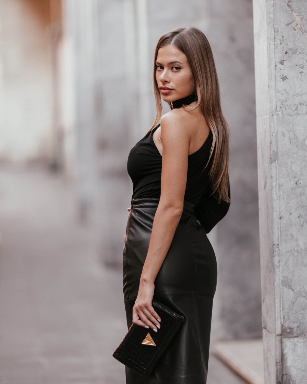 top elegante monospalla con dettaglio choker e fibbia metallica decorativa. Realizzato in morbido tessuto elasticizzato, presenta una manica lunga con volume e spalla scoperta per un look sensuale e sofisticato. La vestibilità aderente esalta la silhouette, ideale per occasioni speciali ed eventi serali.
