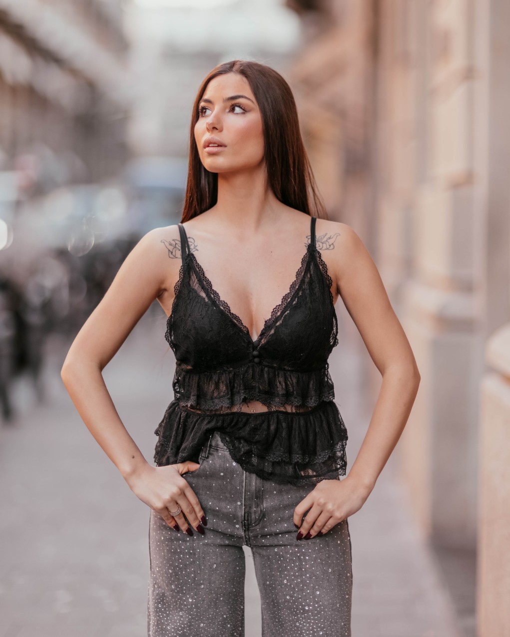 Top in pizzo con spalline sottili dallo stile romantico e femminile, perfetto per occasioni speciali o serate eleganti. Realizzato interamente in delicato pizzo floreale con dettagli a balze sovrapposte che creano un effetto voluminoso e raffinato. La scollatura profonda a V e le rifiniture arricchite valorizzano la silhouette, mentre le spalline regolabili garantiscono una vestibilità confortevole e personalizzabile.