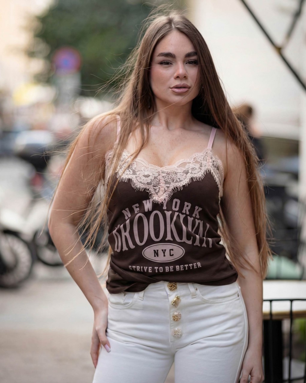 Top con spalline sottili dallo stile urban-chic, caratterizzato da eleganti inserti in pizzo floreale sulla scollatura. Realizzato in morbido cotone con stampa grafica "Brooklyn NYC", unisce il comfort di un capo casual alla raffinatezza dei dettagli femminili. La vestibilità è aderente e valorizzante, ideale per look quotidiani versatili. Perfetto da abbinare a jeans o pantaloni per un outfit contemporaneo e di tendenza.