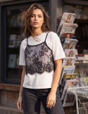 Top con spalline sottili dallo stile urban-chic, caratterizzato da eleganti inserti in pizzo floreale sulla scollatura. Realizzato in morbido cotone con stampa grafica "Brooklyn NYC", unisce il comfort di un capo casual alla raffinatezza dei dettagli femminili. La vestibilità è aderente e valorizzante, ideale per look quotidiani versatili. Perfetto da abbinare a jeans o pantaloni per un outfit contemporaneo e di tendenza.