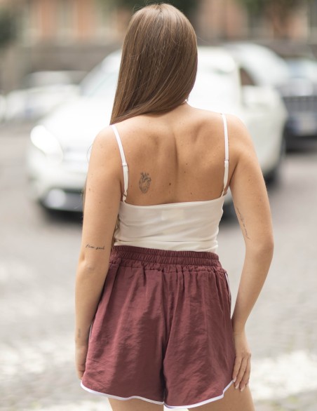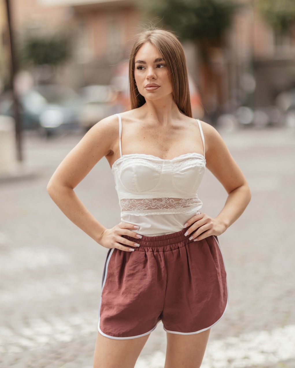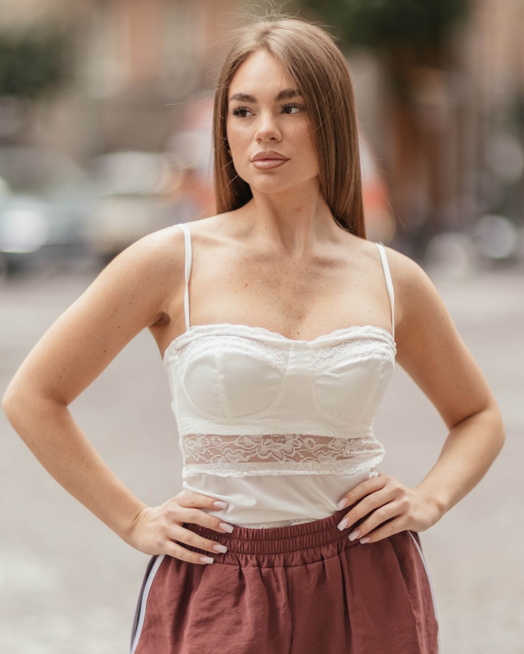 Top lingerie con dettagli in pizzo. Spalline sottili regolabili. Coppe foderate. Stessuto satin elasticizzato.