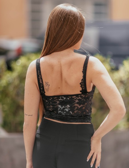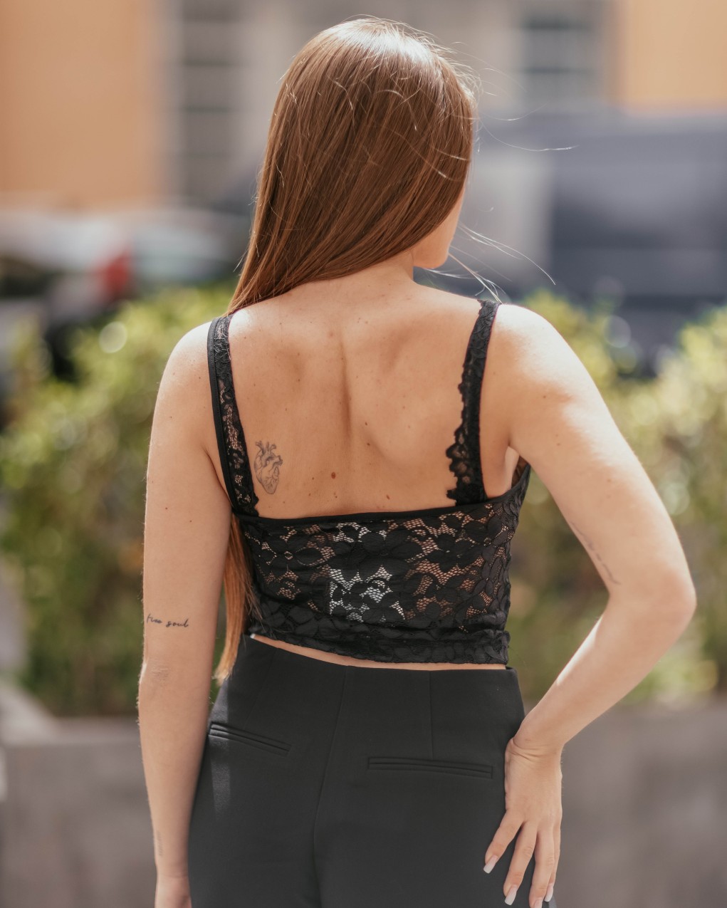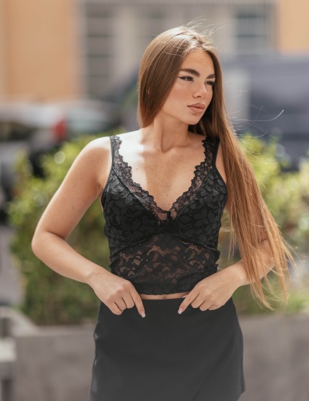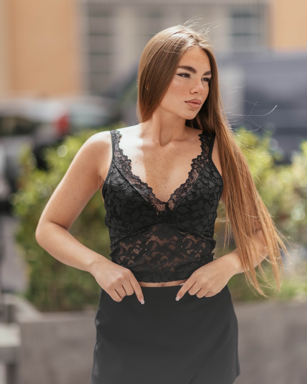 Top femminile in pizzo floreale dallo stile romantico e sofisticato, perfetto per outfit eleganti e occasioni speciali. Caratterizzato da spalline sottili e profonda scollatura a V impreziosita da bordure in pizzo, questo capo presenta una lavorazione delicata e trasparente che crea un effetto sensuale e raffinato. Realizzato interamente in pizzo elasticizzato di alta qualità, offre una vestibilità aderente che valorizza la silhouette con comfort e morbidezza. Ideale da abbinare a pantaloni a vita alta o gonne per un look femminile e contemporaneo.