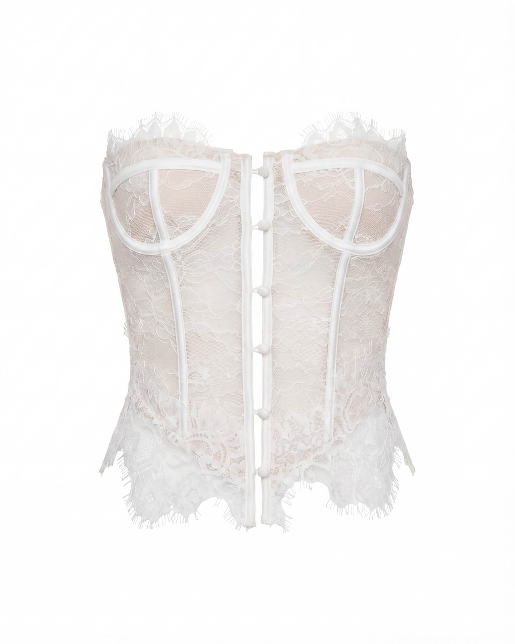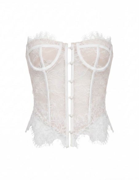 Bustier corsetto in elegante pizzo floreale con dettagli a contrasto, perfetto per look romantici e sofisticati. Realizzato in delicato pizzo traforato con motivi floreali, presenta una chiusura frontale con gancetti e finiture con bordi sfrangiati decorativi. La struttura aderente e modellante valorizza la silhouette, mentre il design trasparente aggiunge un tocco sensuale e femminile. Ideale da indossare sopra camicie o top per creare outfit stratificati di tendenza.