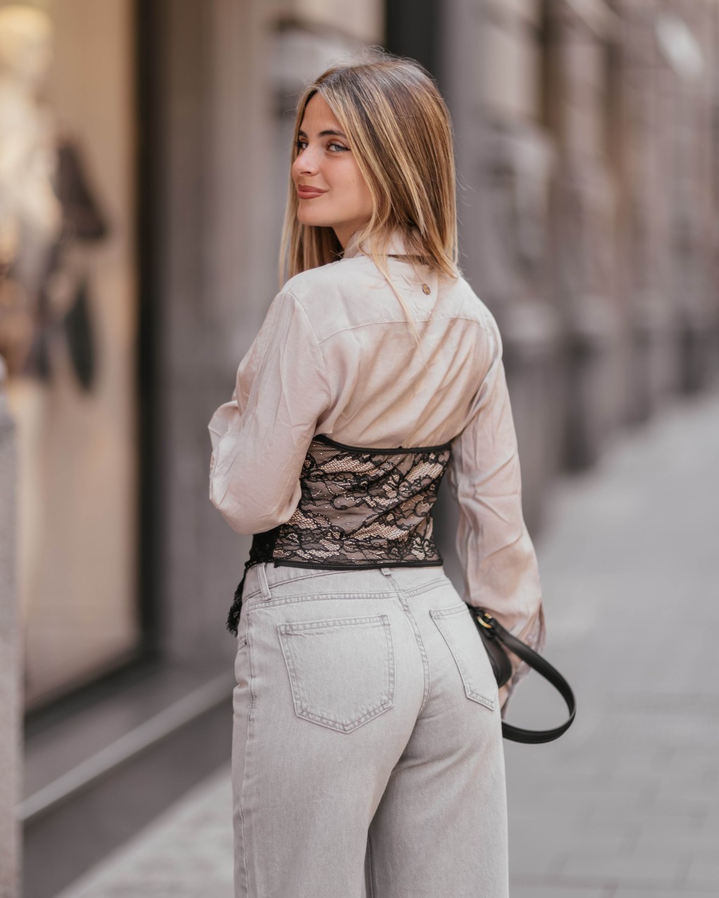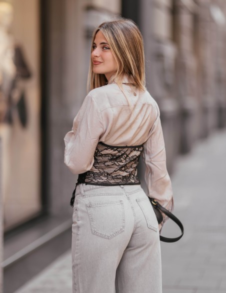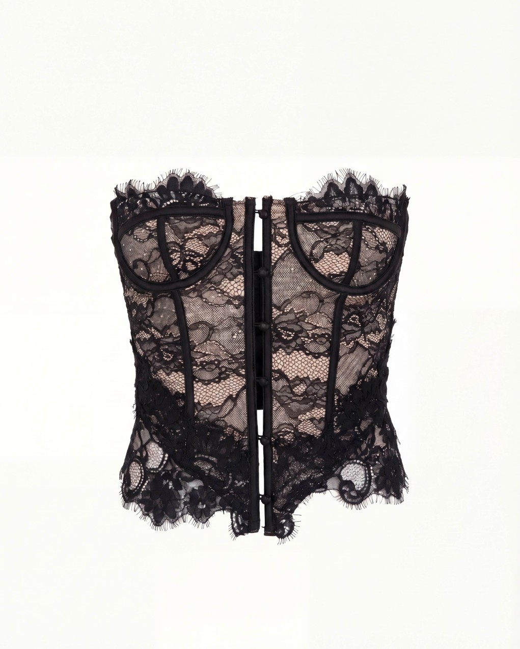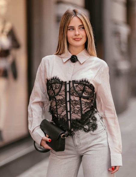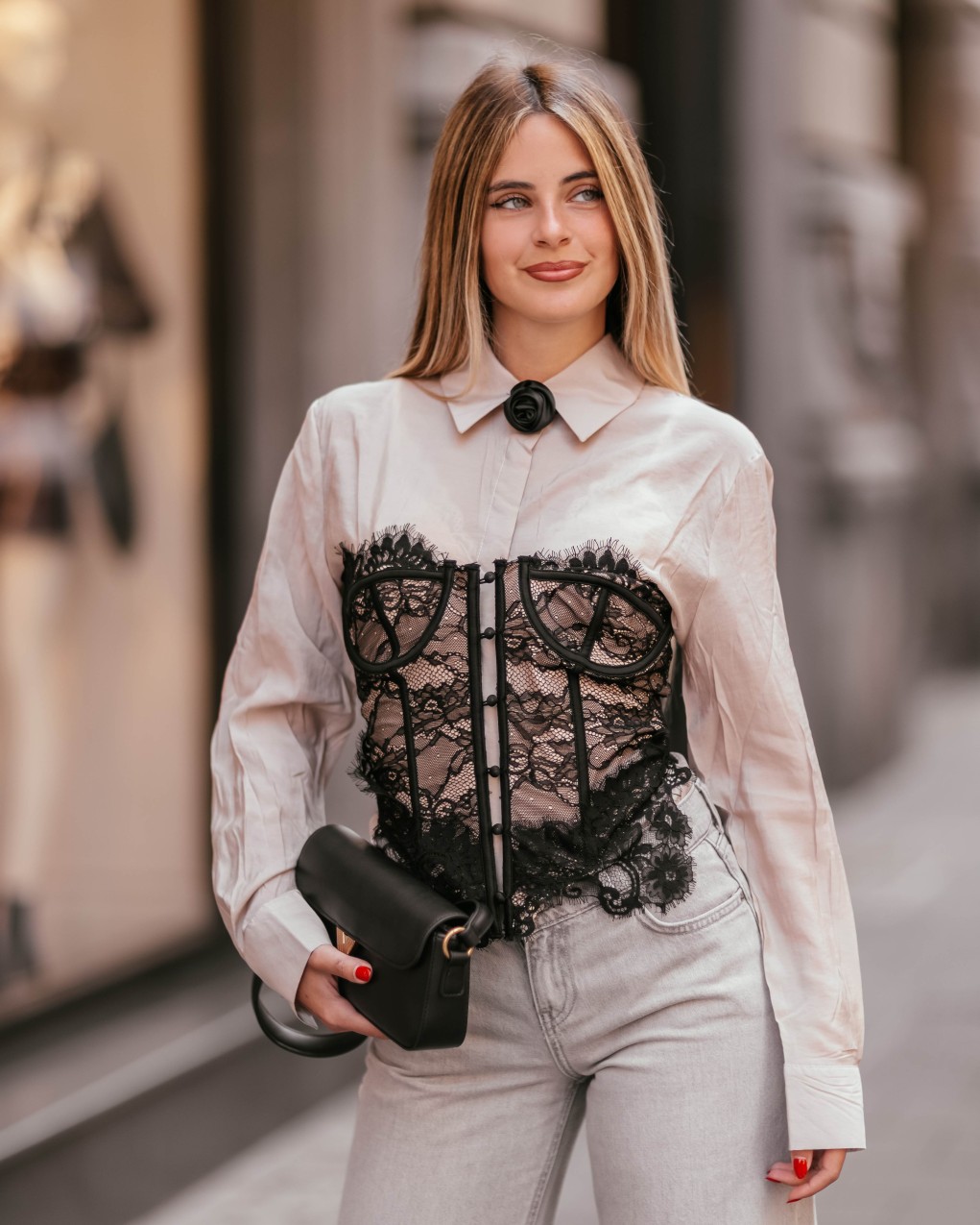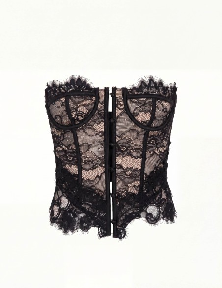 Bustier corsetto in elegante pizzo floreale con dettagli a contrasto, perfetto per look romantici e sofisticati. Realizzato in delicato pizzo traforato con motivi floreali, presenta una chiusura frontale con gancetti e finiture con bordi sfrangiati decorativi. La struttura aderente e modellante valorizza la silhouette, mentre il design trasparente aggiunge un tocco sensuale e femminile. Ideale da indossare sopra camicie o top per creare outfit stratificati di tendenza.