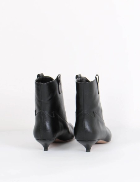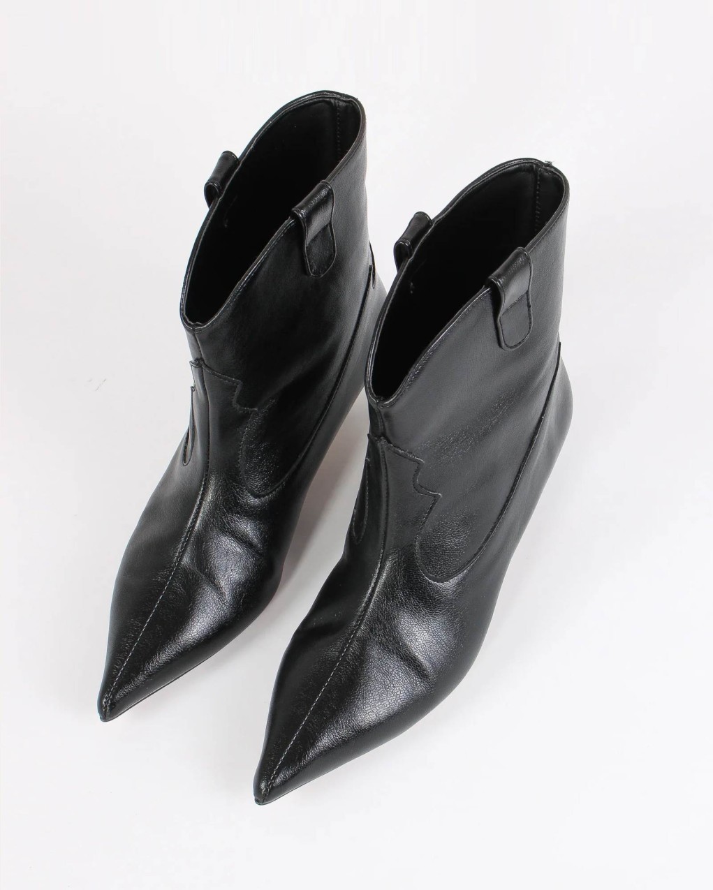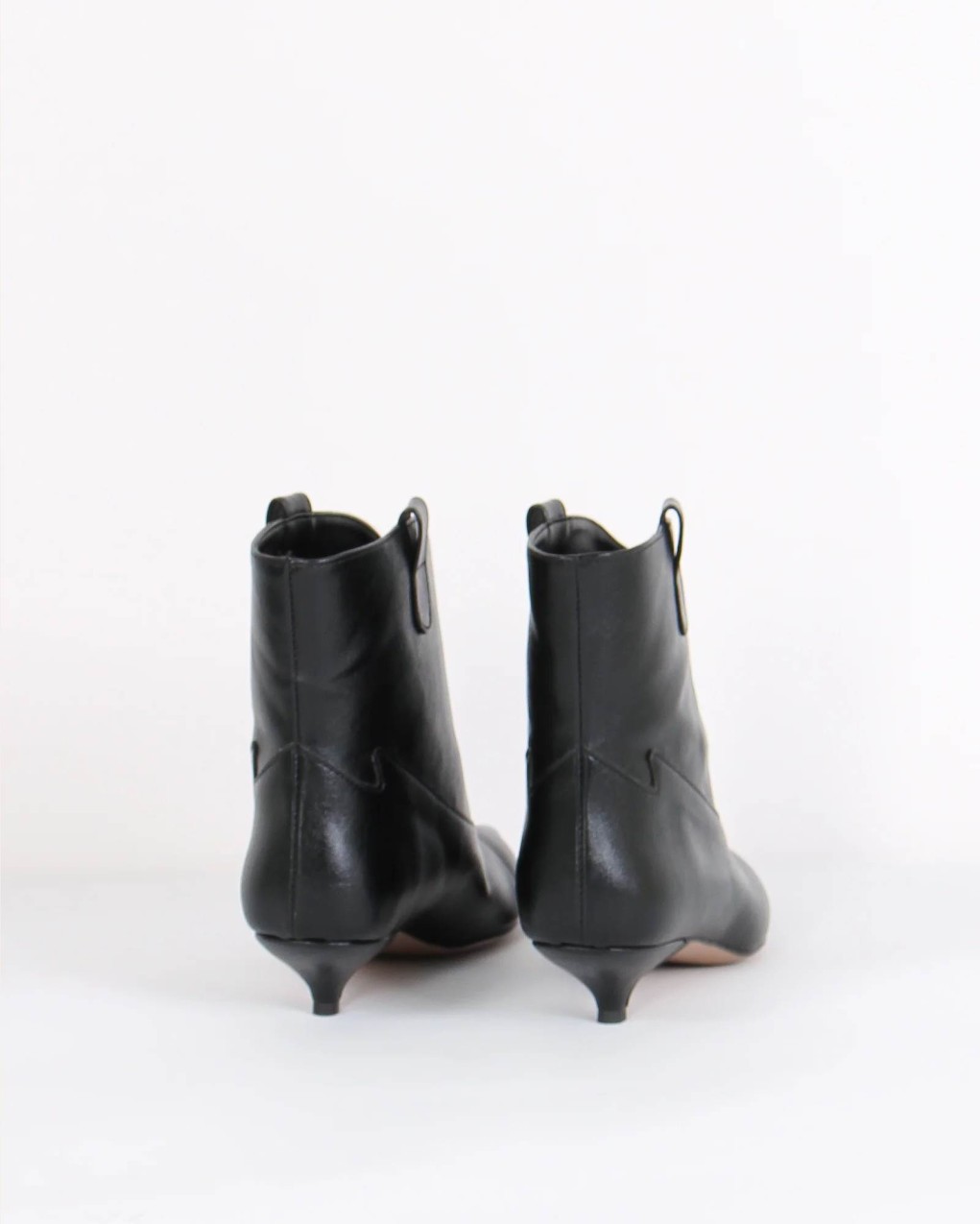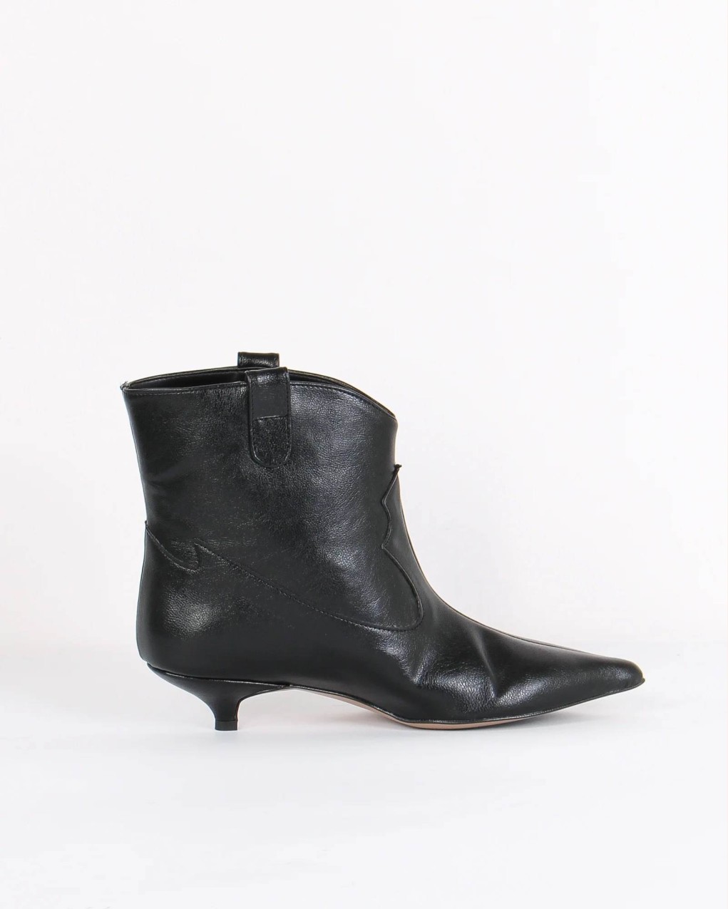 Stivaletto elegante in pelle con design ispirato allo stile western, caratterizzato da un raffinato tacco a rocchetto. La struttura a punta e la caviglia leggermente sagomata donano un look sofisticato e contemporaneo. Realizzato in morbida pelle di alta qualità, garantisce comfort e vestibilità ottimale grazie alla forma aderente e alla chiusura semplificata.