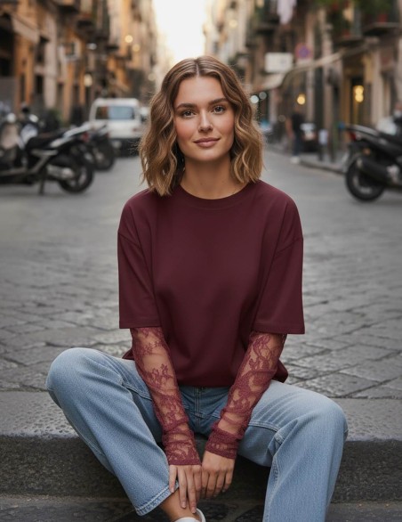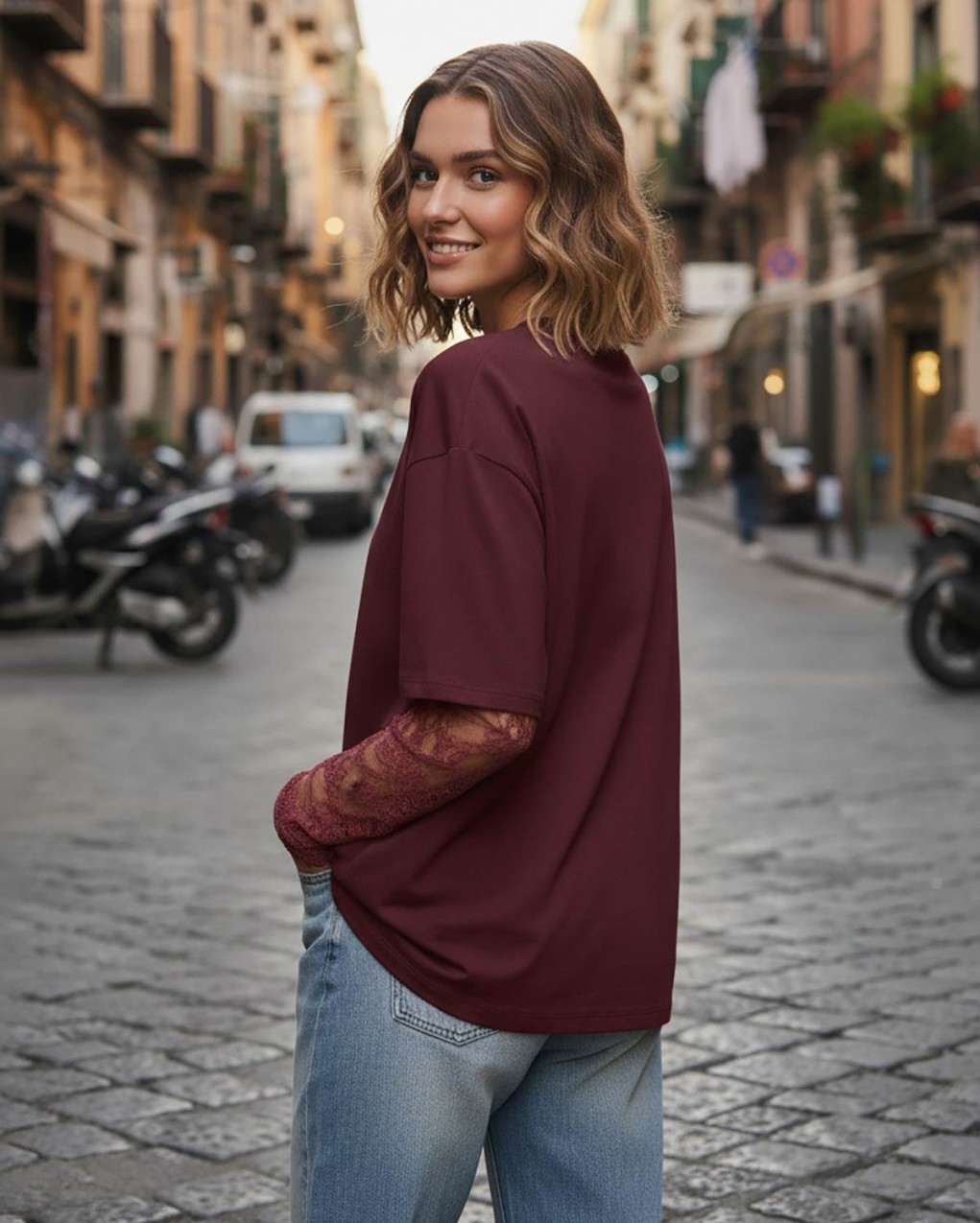 T-shirt girocollo maniche corte effetto combinato con maniche lunghe in pizzo trasparente. Dettaglio spalle imbottite.