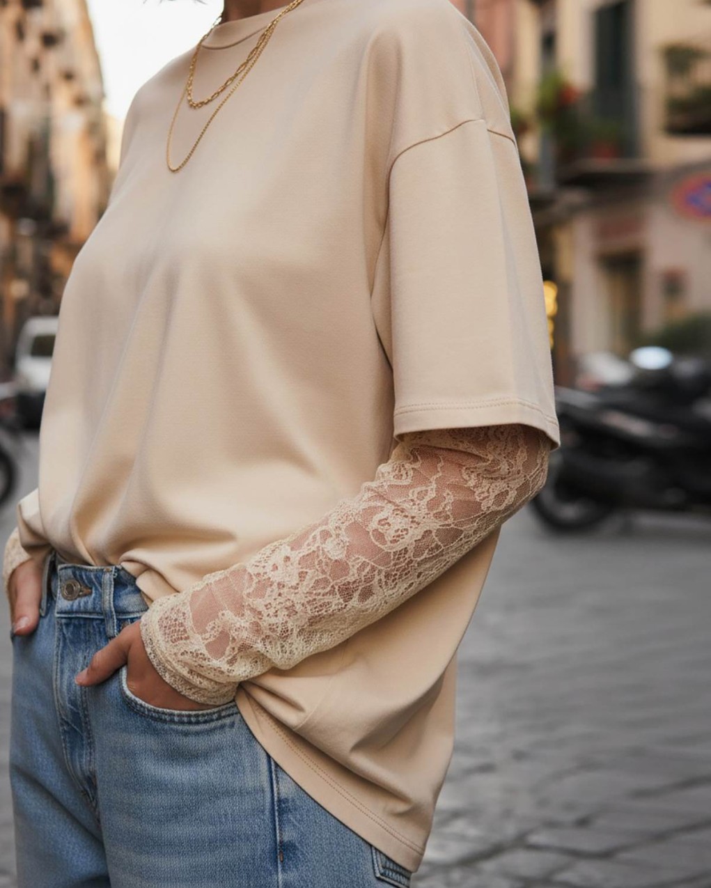 T-shirt girocollo maniche corte effetto combinato con maniche lunghe in pizzo trasparente. Dettaglio spalle imbottite.