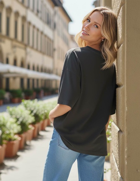 ●Maglia oversize dal design essenziale realizzata in morbido cotone premium, caratterizzata da maniche a tre quarti e linea rilassata. La vestibilità comoda e il taglio contemporaneo la rendono perfetta per look casual-chic. La qualità del tessuto garantisce comfort e durata nel tempo, mentre la silhouette versatile si abbina facilmente a jeans e pantaloni.