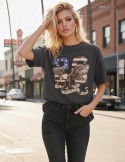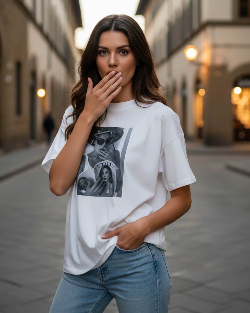 T-shirt oversize in morbido cotone premium con stampa fotografica vintage sul fronte. Il taglio rilassato e le maniche corte conferiscono un look casual-chic, mentre la qualità del tessuto garantisce comfort e durabilità nel tempo. Perfetta da abbinare a jeans o pantaloni casual per un outfit dall'eleganza contemporanea.