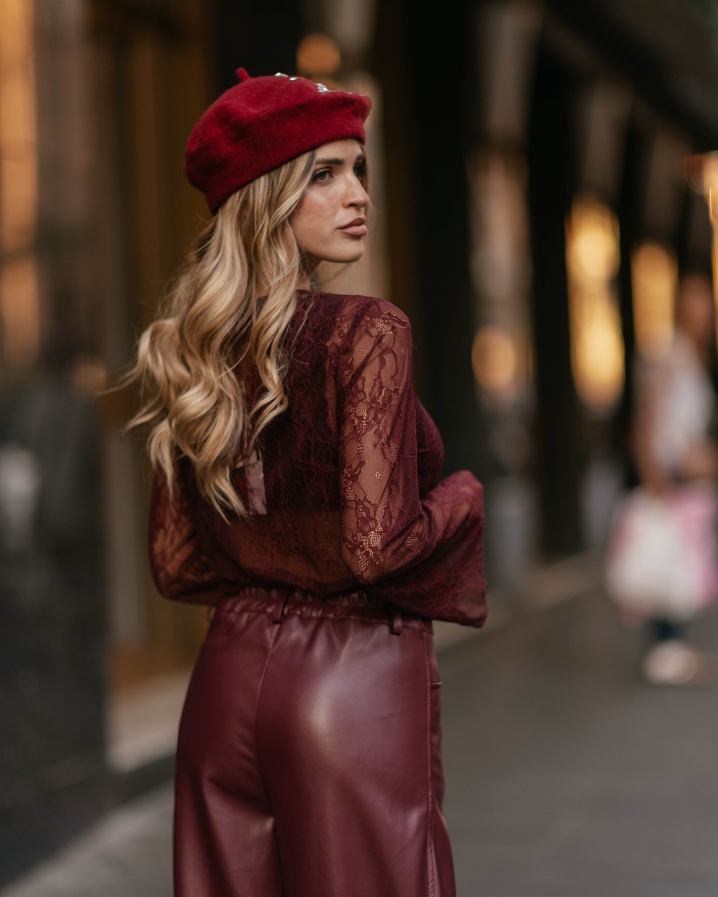 Elegante blusa in pizzo trasparente con lavorazione floreale e maniche lunghe a sbuffo. Il design romantico presenta una texture delicata e raffinata che si adatta perfettamente alla silhouette. Vestibilità morbida e femminile, ideale per outfit sofisticati da giorno e da sera.