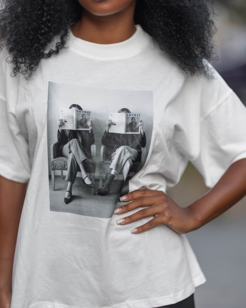 T-shirt in morbido cotone con stampa artistica vintage in stile fotografico. Il taglio oversize offre una vestibilità comoda e rilassata, perfetta per uno stile casual-chic contemporaneo. La grafica in bianco e nero raffigurante una scena retrò che aggiunge un tocco di raffinata nostalgia al capo.