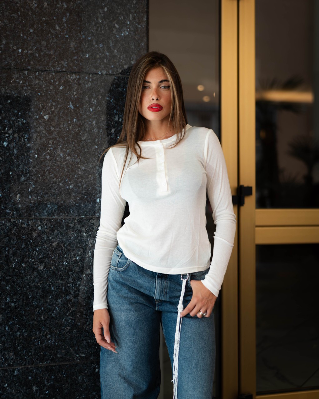 Maglietta a maniche lunghe realizzata in morbido jersey di cotone elasticizzato, caratterizzata da una vestibilità aderente che esalta la silhouette. Il taglio minimal e la linea pulita la rendono un capo essenziale e versatile per il guardaroba quotidiano. La qualità del tessuto garantisce comfort e durata nel tempo, mentre le cuciture rinforzate assicurano una perfetta tenuta del capo.