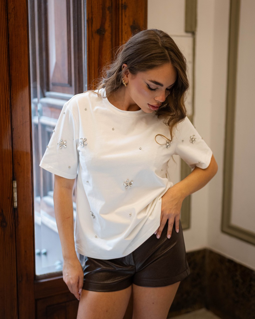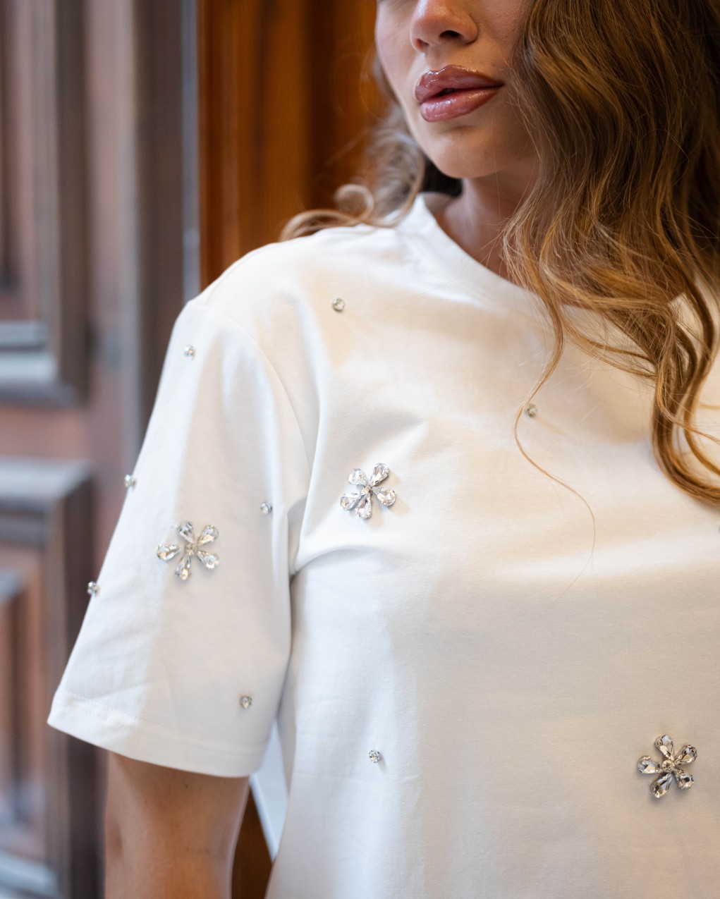 T-shirt elegante in morbido cotone, impreziosita da delicate applicazioni floreali e perline decorative distribuite sul tessuto. Il taglio casual-chic presenta maniche a mezzo braccio e una vestibilità comoda ma femminile. Un capo versatile che unisce comfort e raffinatezza, perfetto per completare look sia casual che ricercati.